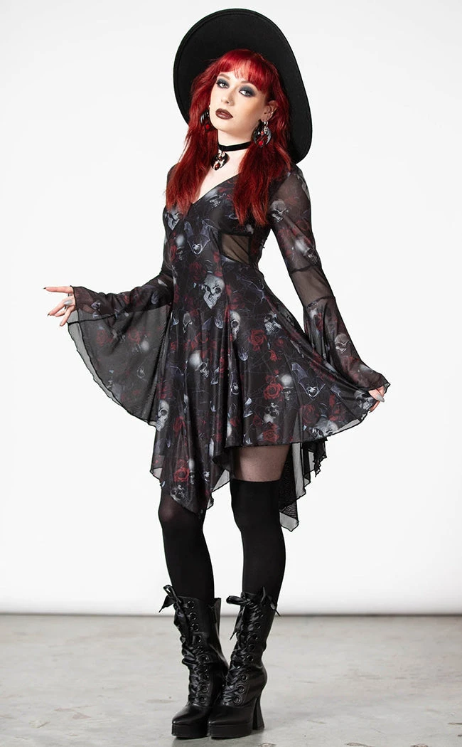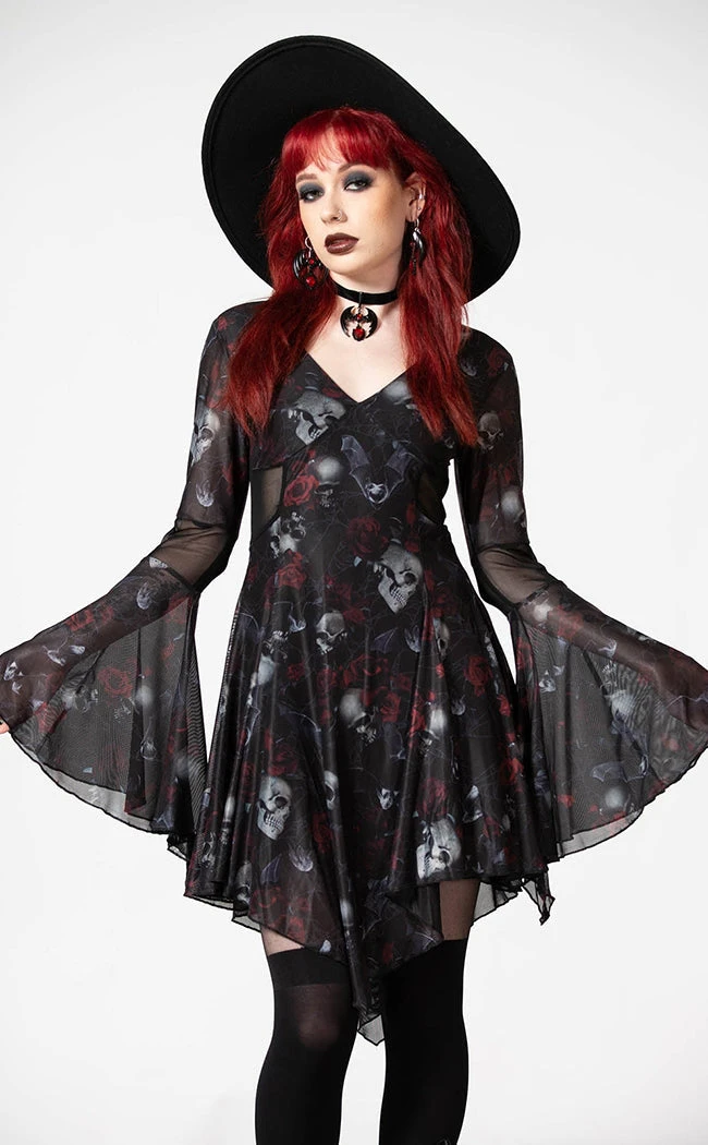 Witch it up garden style in the Bellaflora Mesh Dress! Soft, stretch mesh is printed with a wicked motif of roses, bats and skulls, aka, the best things in life. The dress has opaque lining and features bewitching bell sleeves, a V neck, a fitted waist and a hanky hem.