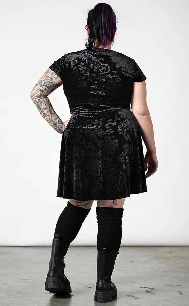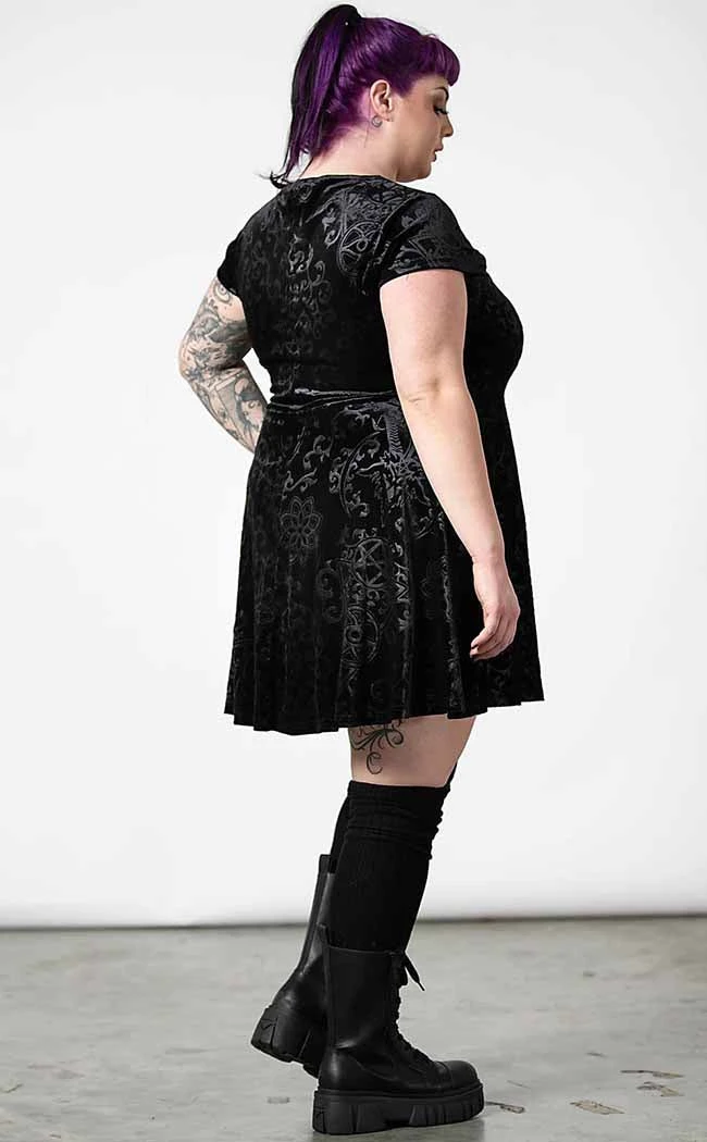 Dress for a casual bout of heresy in the Blasphemia Keyhole Skater Dress! The soft, stretch velvet is embossed with a wicked burnout patter, forming this cap sleeve skater with a fitted waist. The keyhole chest draws the eye and is the perfect place to show off your favourite pendant necklaces (among other things.
