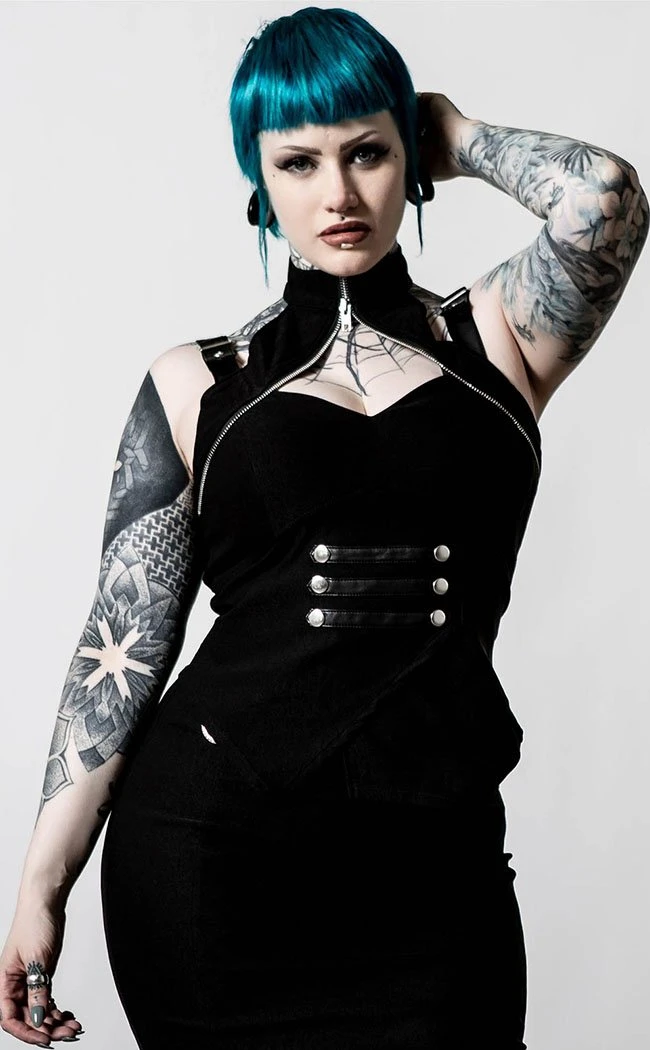 Bring out some military chic with the Bullet Babe Top! The top hugs yer body with soft stretch fabric and a fitted waist. The high neck sits over a sultry cutout detail, adding to the edgy chic of the faux leather and button decals.