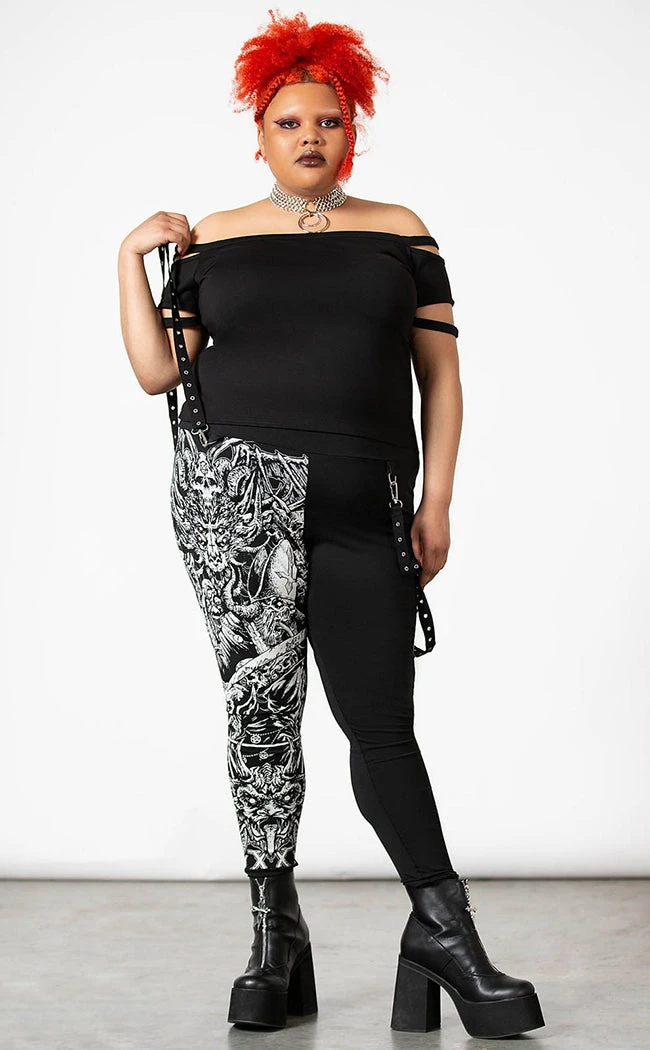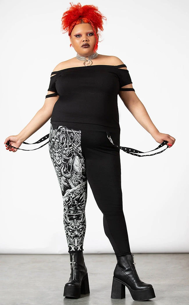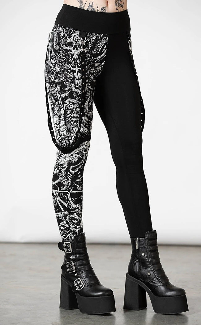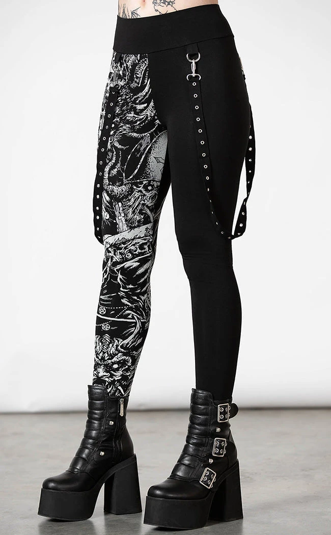 Blow their minds with the Amnesia Leggings! Soft, stretch cotton forms these close-fitting leggings, featuring a statement contrast print completely covering one leg. The leggings sit high on the waist with a wide waistband and also feature detachable, multiway bondage straps.