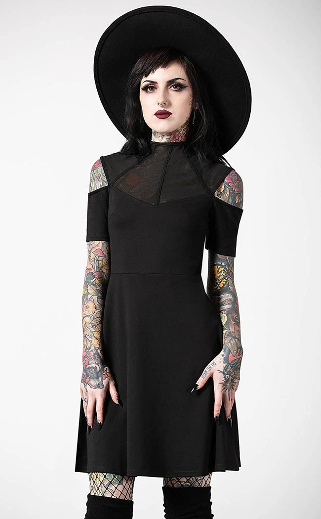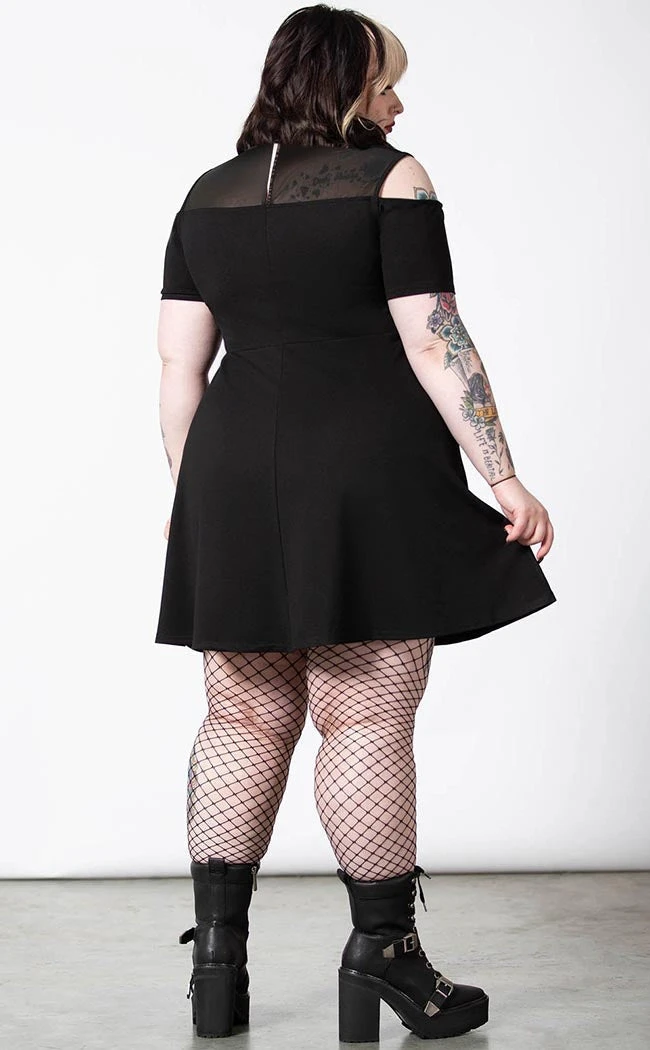 Show off your celestial body in the Astra Skater Dress! Soft stretch fabric floats around and fits to your figure, forming cutout sleeves and a high statement neckline complete with a mesh cutout. An absolute must for lunar dolls!Â