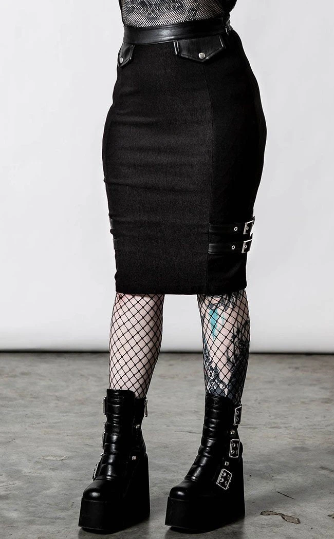 Get yerself looking professional and battle-ready with the Bayonet Pencil Skirt! The midi-length hugs yer legs with soft stretch fabric, while faux leather details at the waistband, faux pocket tabs and straps catch the eye.