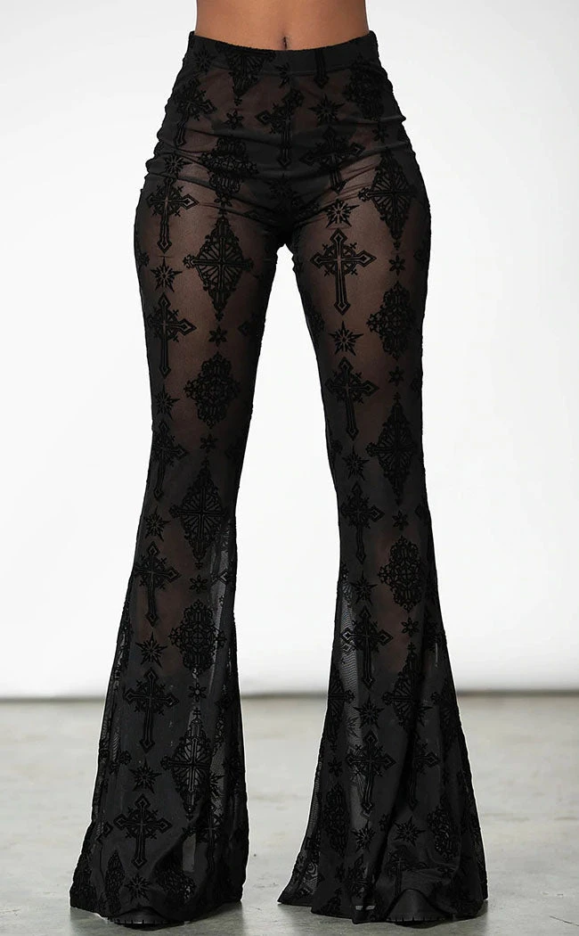 Cause a stir in the pews with the Bless Me Mesh Bell Bottoms! Statement flocked mesh forms these sheer retro flares, fitting at the waist and flowing around your legs as yuo tread hallowed ground.