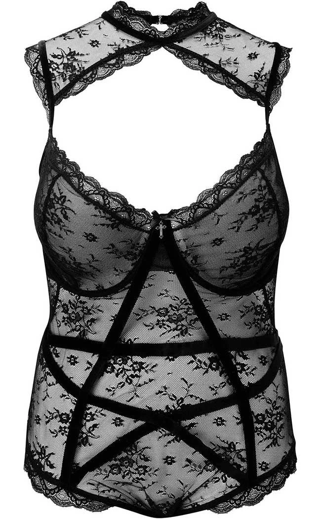 The Dark Desire Lace bodysuit will worship your curves and make jaws drop. Soft, luxury lace stretches across your bod with floral patterns, a pentagram stretching across the front. A statement lace yoke sets this apart from standard bodysuits, all trimmed with ruffles.