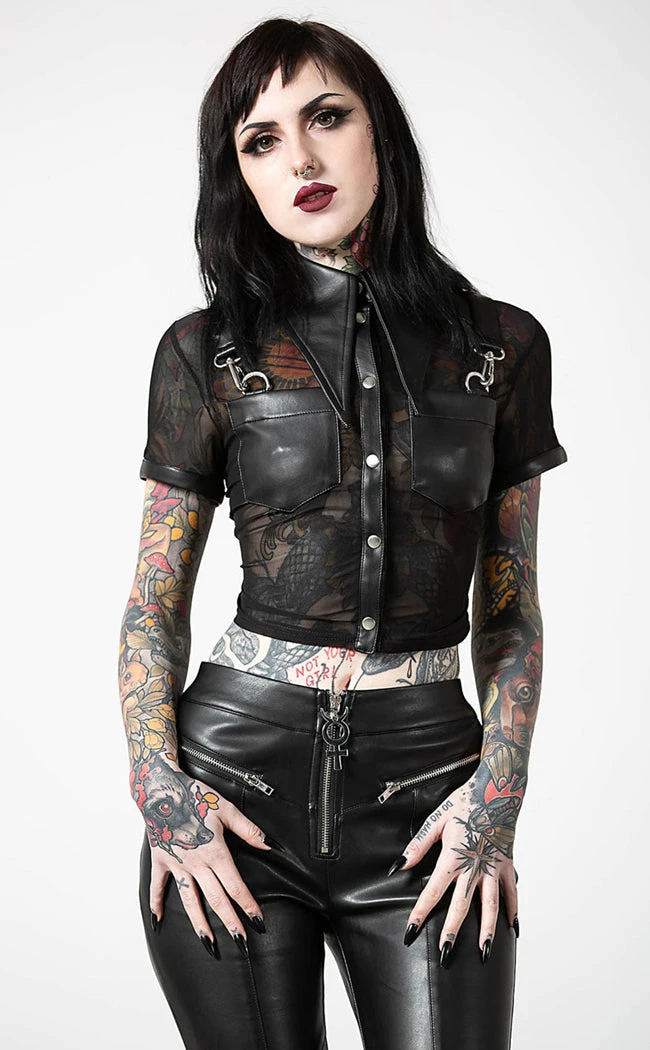Get down to business in the Dark Halo Crop Shirt. Soft stretch mesh forms this button up crop, complete with faux leather details including an exaggerated collar, two front pockets and buckled strap details.
