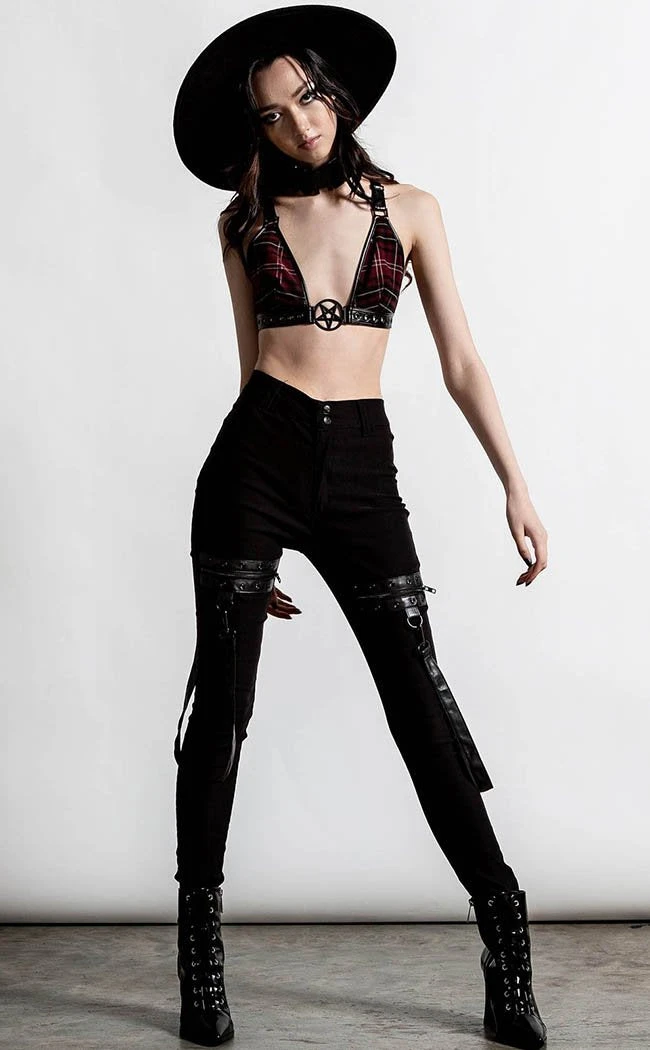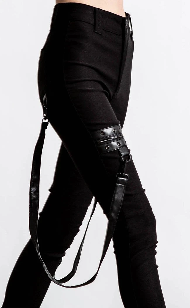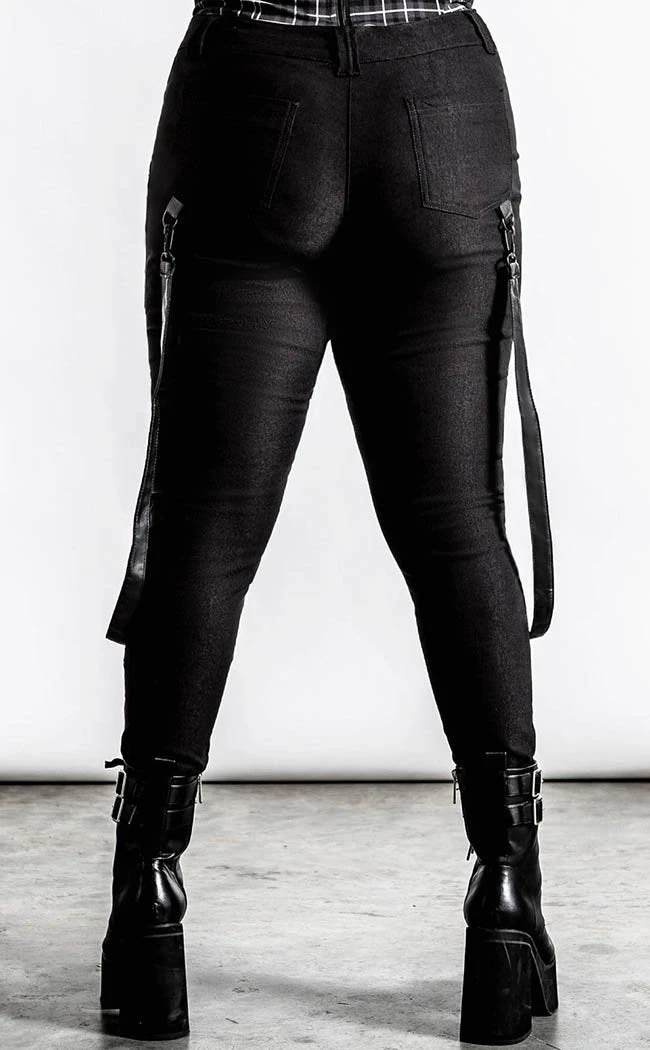 These ain’t yer basic skinny jeans! Super stretchy, super cosy and super rockin’, these pitch black teasers come with statement straps and zip n rivet details on the thighs for a deadly flair.