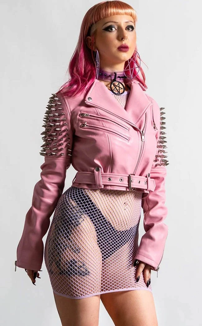 Get threatening in bubblegum threads with the Disharmony Biker Jacket. Studded to hell and back again, this classic biker silhouette is decked out with statement zips, a waist belt and a sexy cropped length. All in Killstar’s A grade vegan leather, built to last and slay all day.