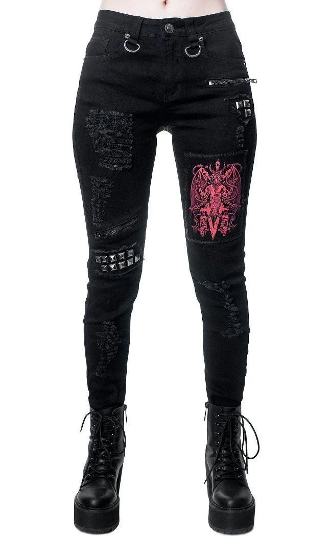 Forsake your masters, not your style. These heavy metal jeans bring distressed, punk style with a bloody pop of colour. Baphomet sits proudly on the thigh, jeggedly stitched in with thick thread among puramid studs and frays.