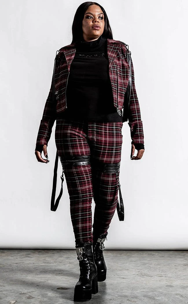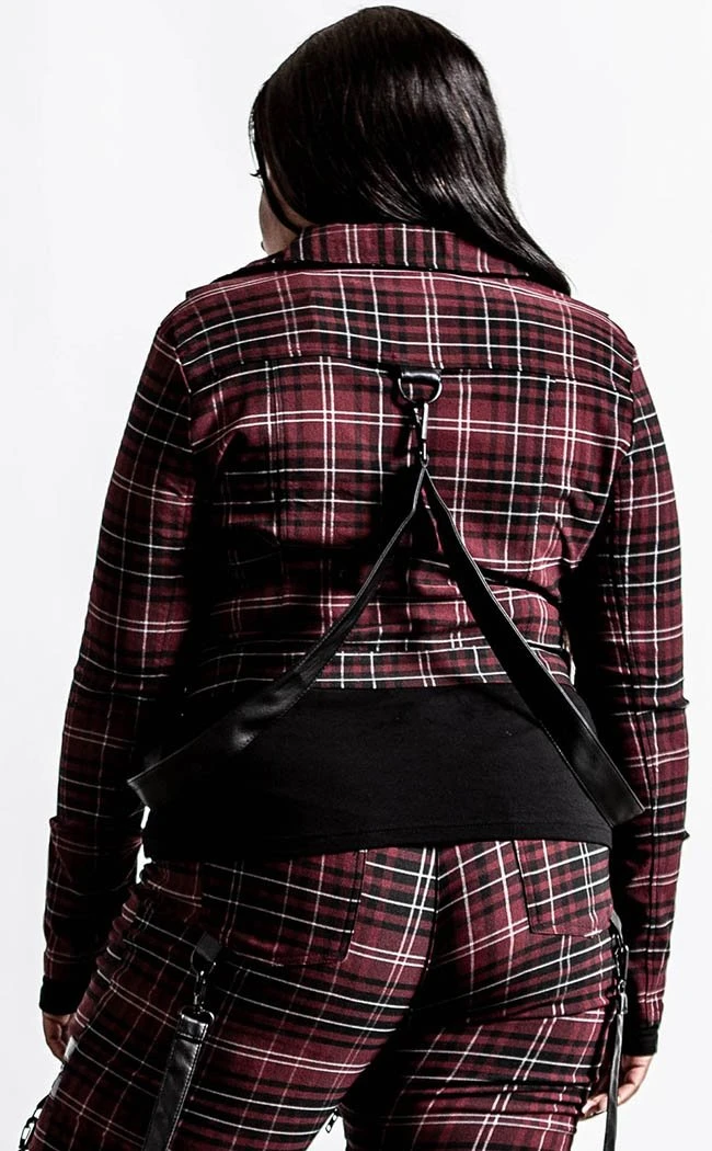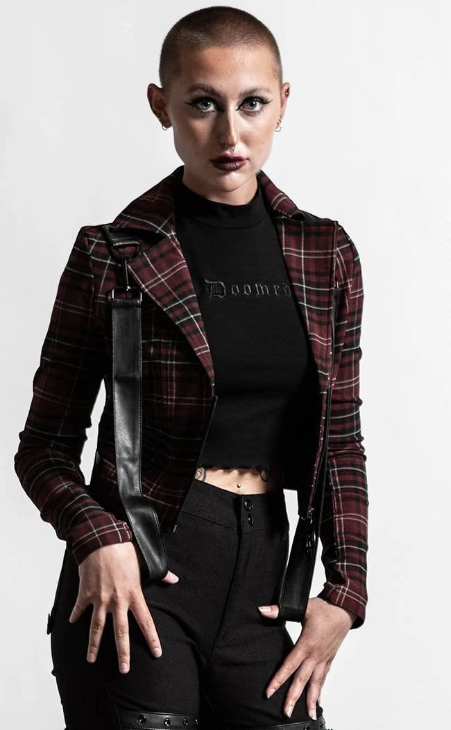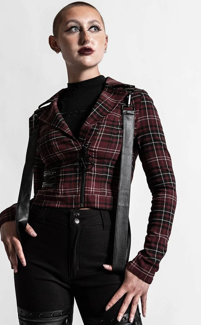 Let it fly in this classy yet kickass jacket! The length is cropped and removable statement straps wind from the back to the shoulders. The front zips up with a chunky pentagram charm to keep you warm with the passion that burns within.