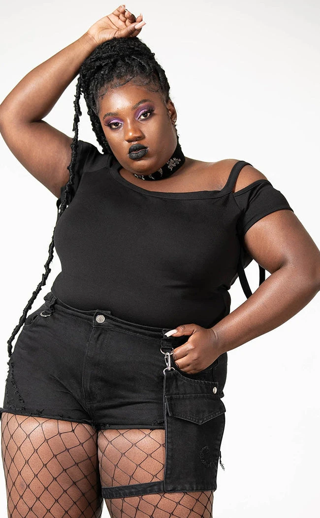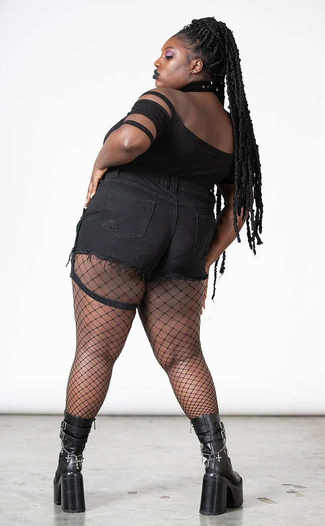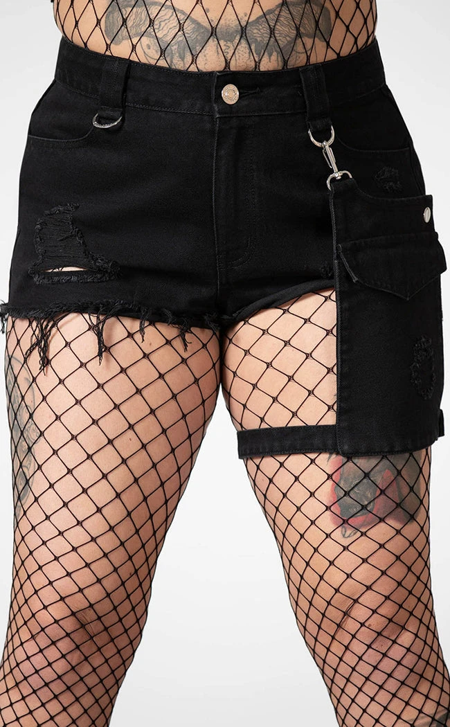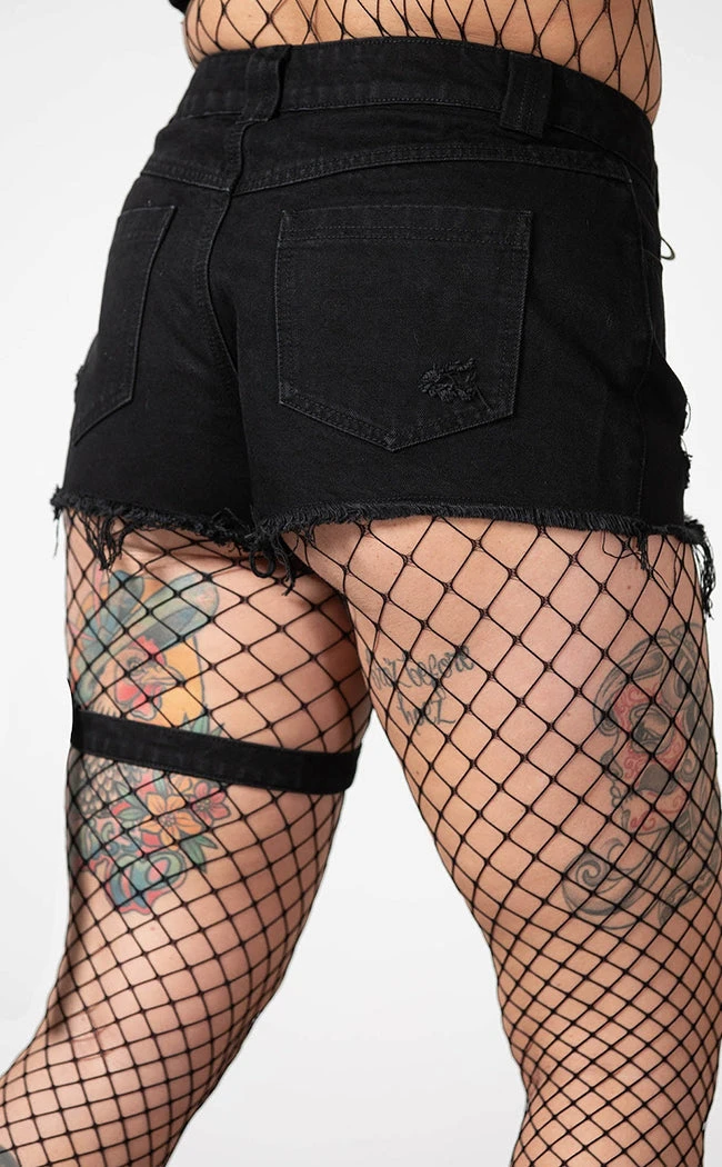 Take a stand in the Fury Road Denim Garter Shorts! Distressed denim forms these badass shorts, featuring D rings, a button fly closure and pockets. A detachable pouch fits to the leg with an adjustable strap, great for concerts and hiding snacks.