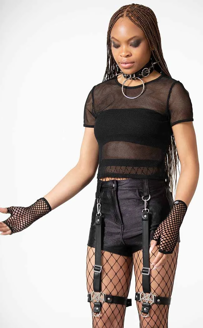Kick off yer gigs in style with the Hardliner Garter Shorts!! Show off yer booty in shiny stretch fabric that forms belt loops, pockets and a button/zip fly. Two detachable garter straps clip to the belt loops, featuring large pentagram hardware and fully adjustable leg straps.