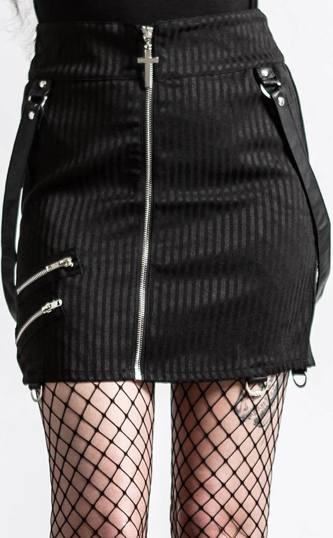 This little skirt screams BAMF! The full length zip comes with a cross charm to match the other zip trims, statement straps snaking around the hips. With a flattering, figure hugging fit you can play match up with all yer dark threads and take it from dusk to dawn!