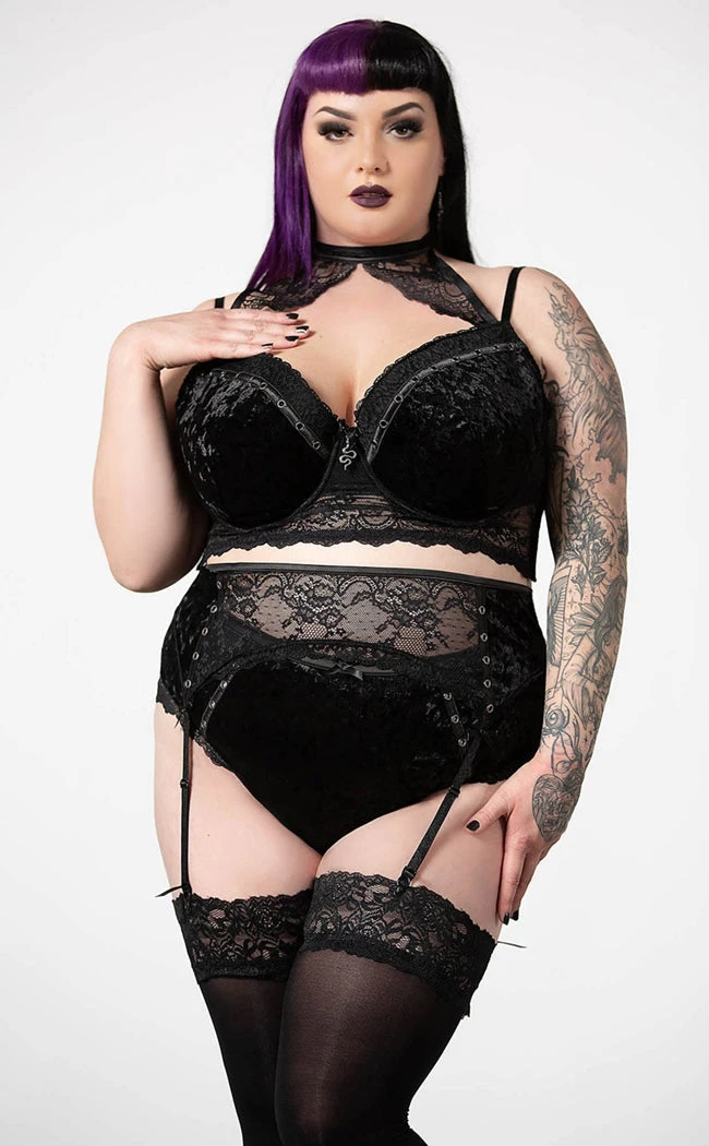 Dress to possess in the Mercy Lace Garter Belt! Let the soft stretch velvet hug your body, trimmed with black lace and metal rivets for a touch of danger. The rear secures with a hook and eye closure and the suspender straps are adjustable.