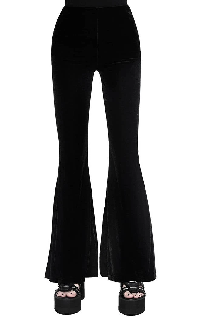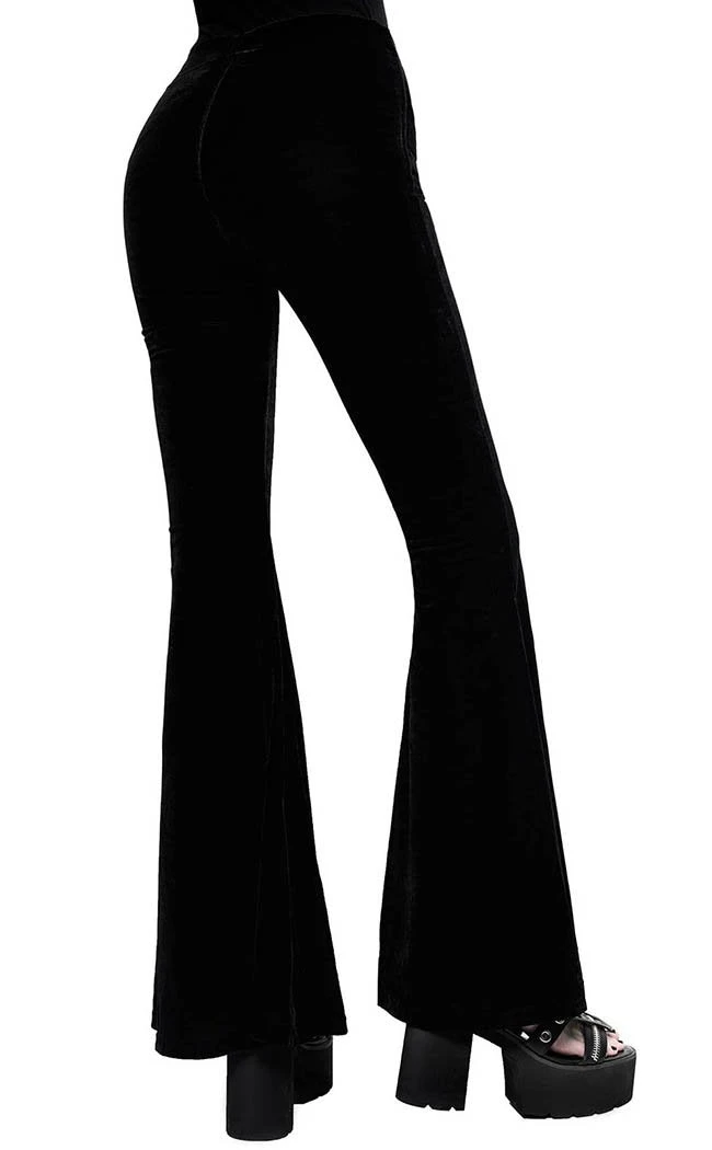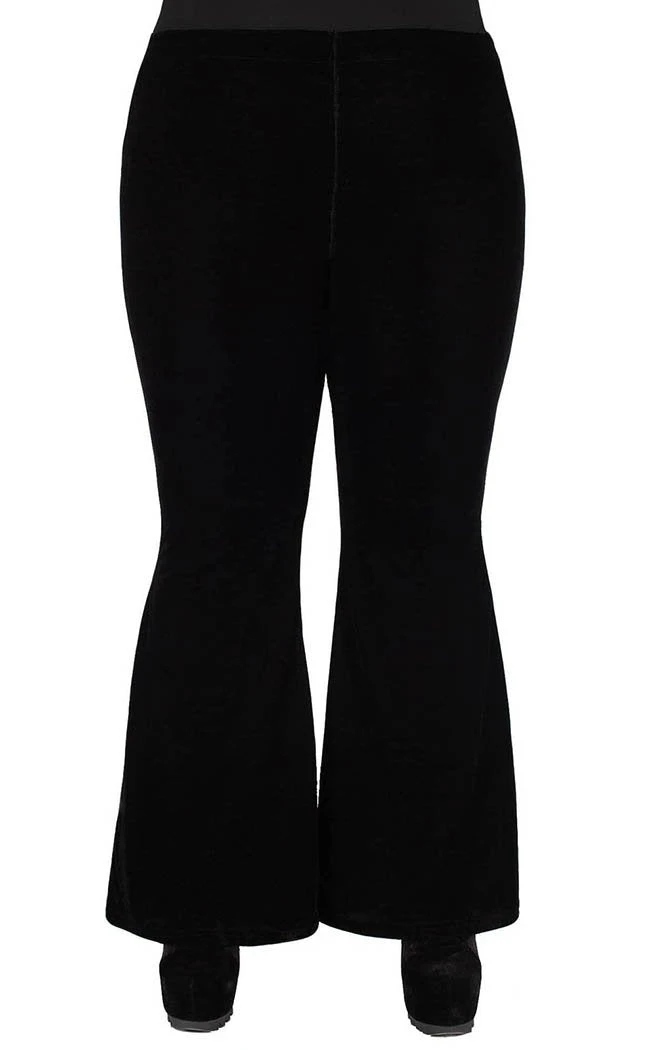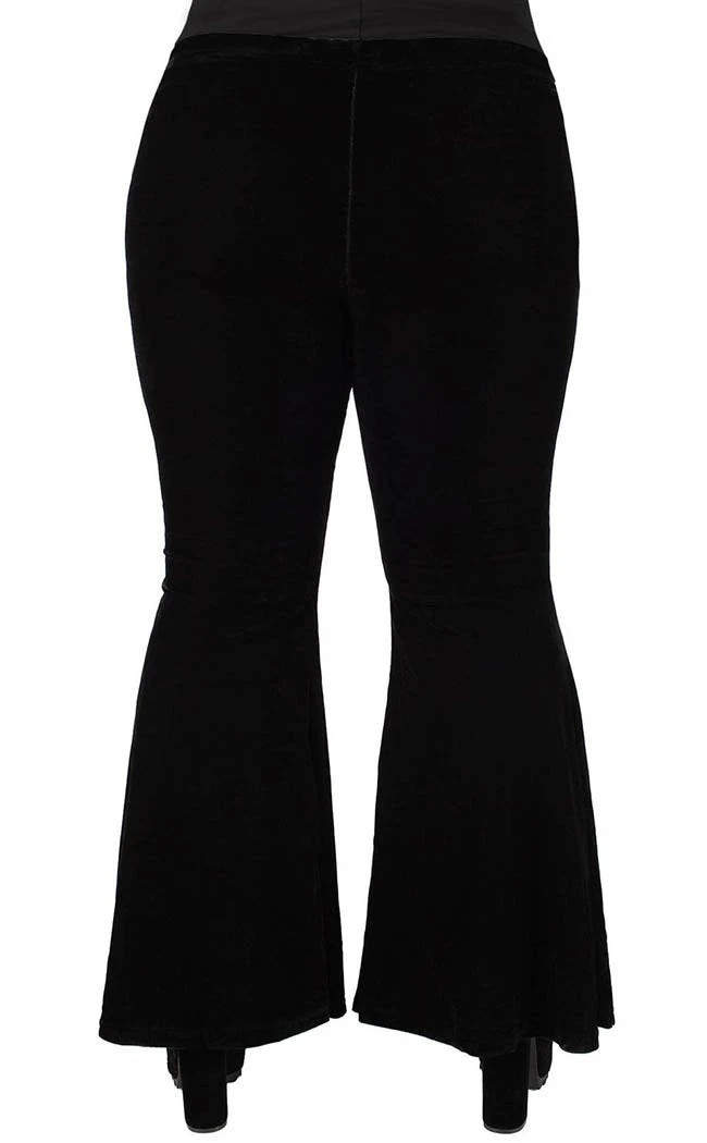 Your new favourite not-so-basic! These bell bottoms are flattering lines of soft, stretch velvet that drape and flatter the figure. With a secure, wide waistband these babies are perfect to pair with crops and heels, ideal for swishing around the dancefloor in.