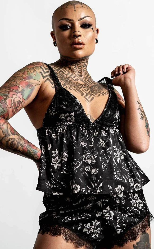 Craft a sultry cocoon in the Moth to Flame PJ set! The matching cami top and shorts are printed with gorgeous moth and floral patterns, trimmed in lace and cosy as hell.