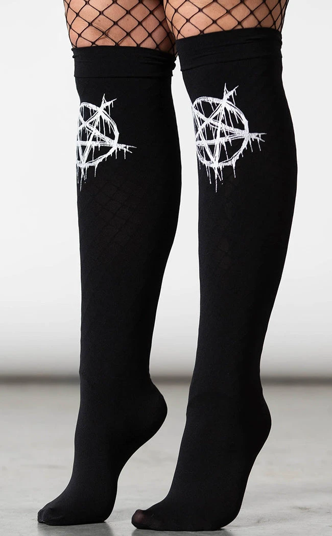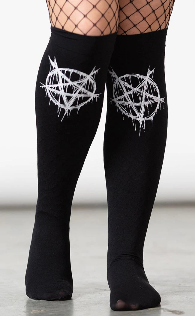 Summon extra stylin’ points with the Pentablood Stockings! These babies are super stretchy and super cosy, featuring bold white pentagrams against the semi-sheer finish of the stocking material.