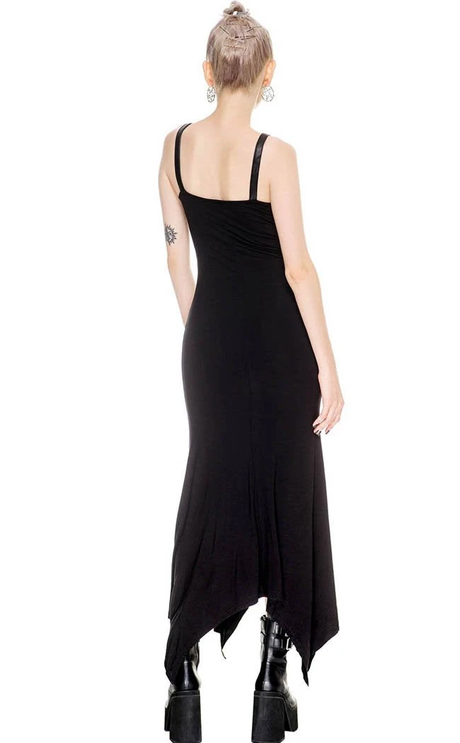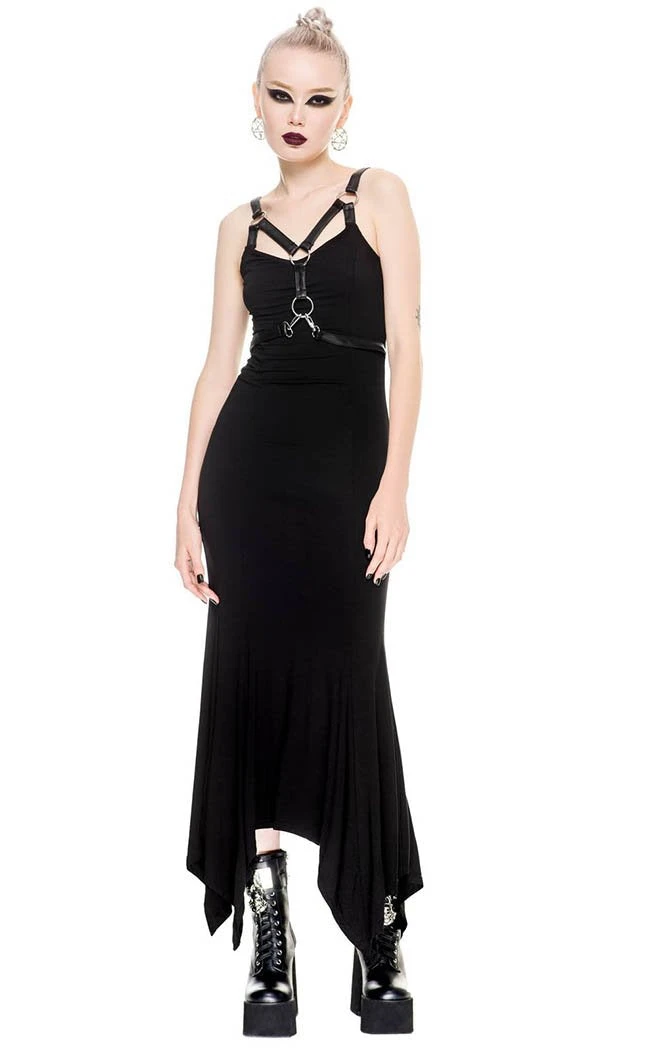 Effortless chic is the name f this sinners game-a harness chest connects to the shoulder straps of this maxi, the material soft and slinky to flow down your bod. The skirt ends in a hanky hem like tendrils of darkness circling your ankles as you stomp the streets.