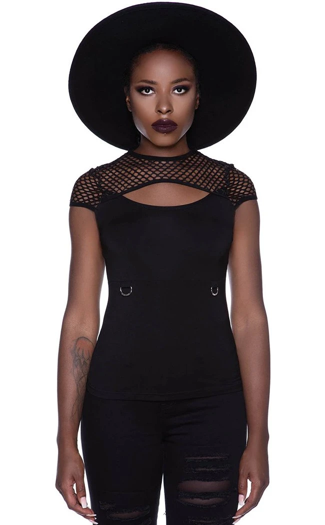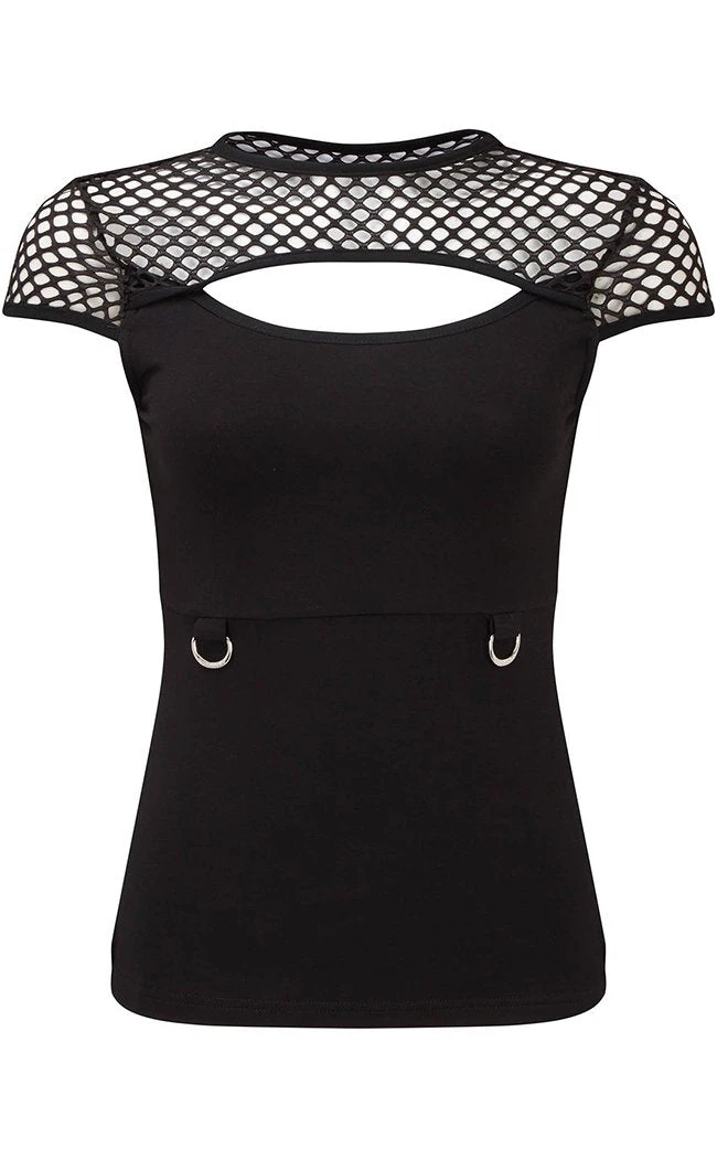 The Ramona cap sleeve top features a high neckline with a fishnet yoke and sleeves, sitting above a keyhole chest. The soft, stretch body is super breathable for all yer summer outfit plans, plus the D ring details mean you can accessorise to hell and back with chains, charms and belts!