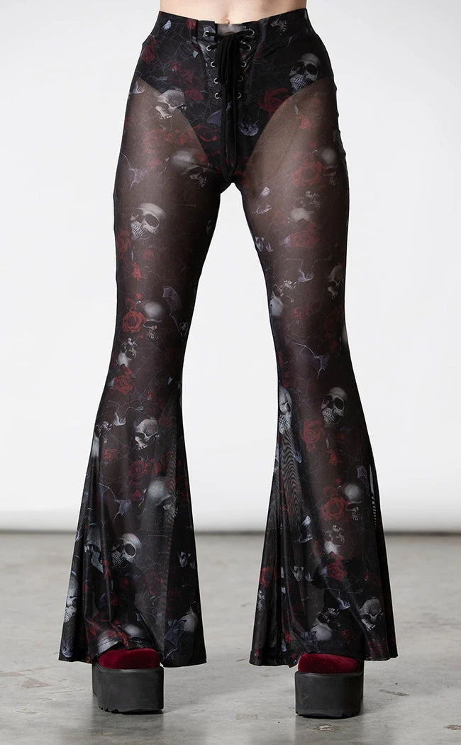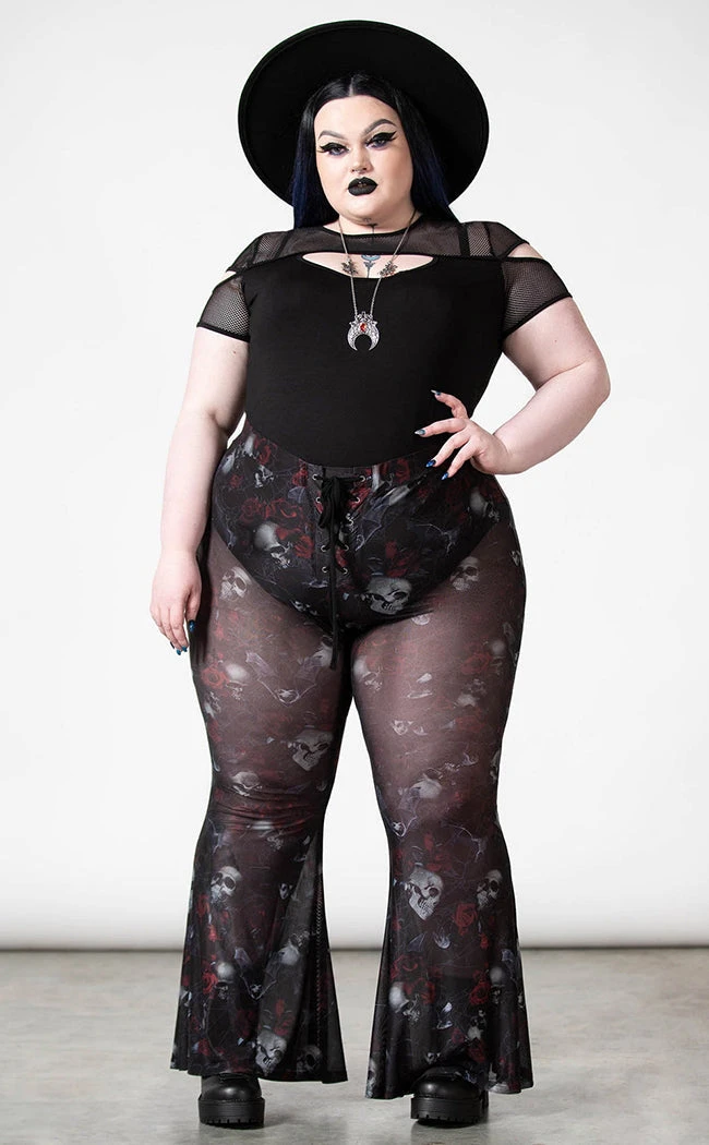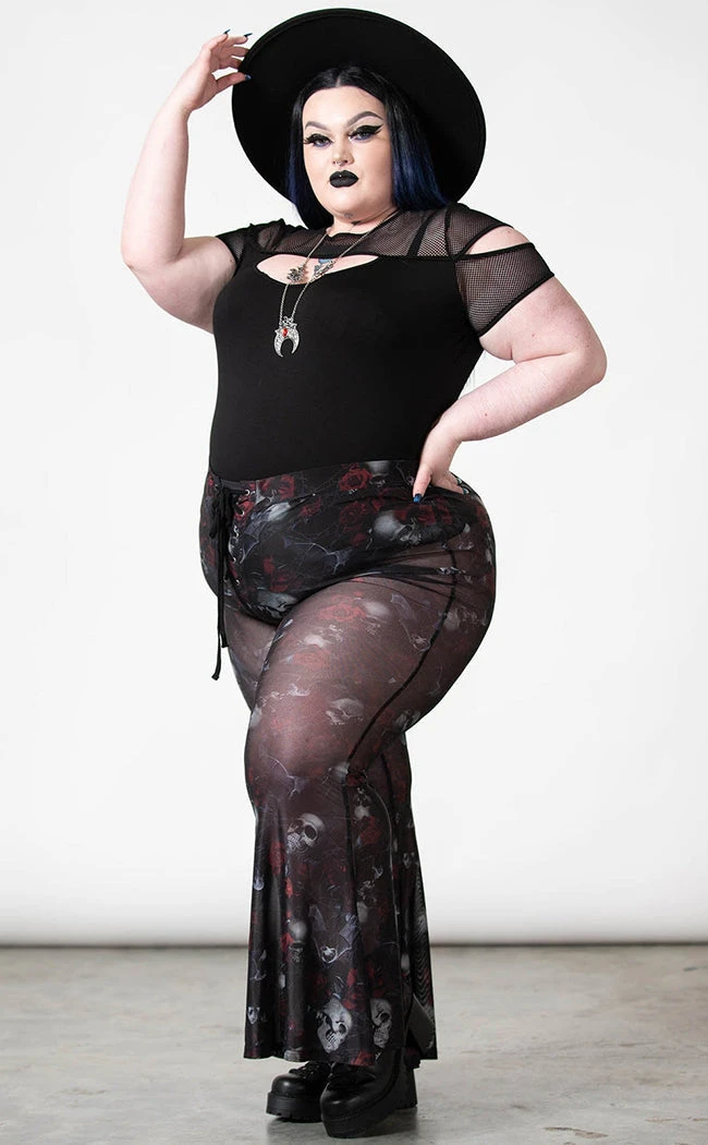 Show off yer gorgeous figure in the Spirala Mesh Bell Bottoms! Soft, stretch mesh is printed with a wicked motif of roses, skulls and bats, forming into flowing bell bottoms. The waist is elasticated for a comfortable fit. The bell-bottoms also feature a lace-up panel and come with panty lining for yer (im)modesty.