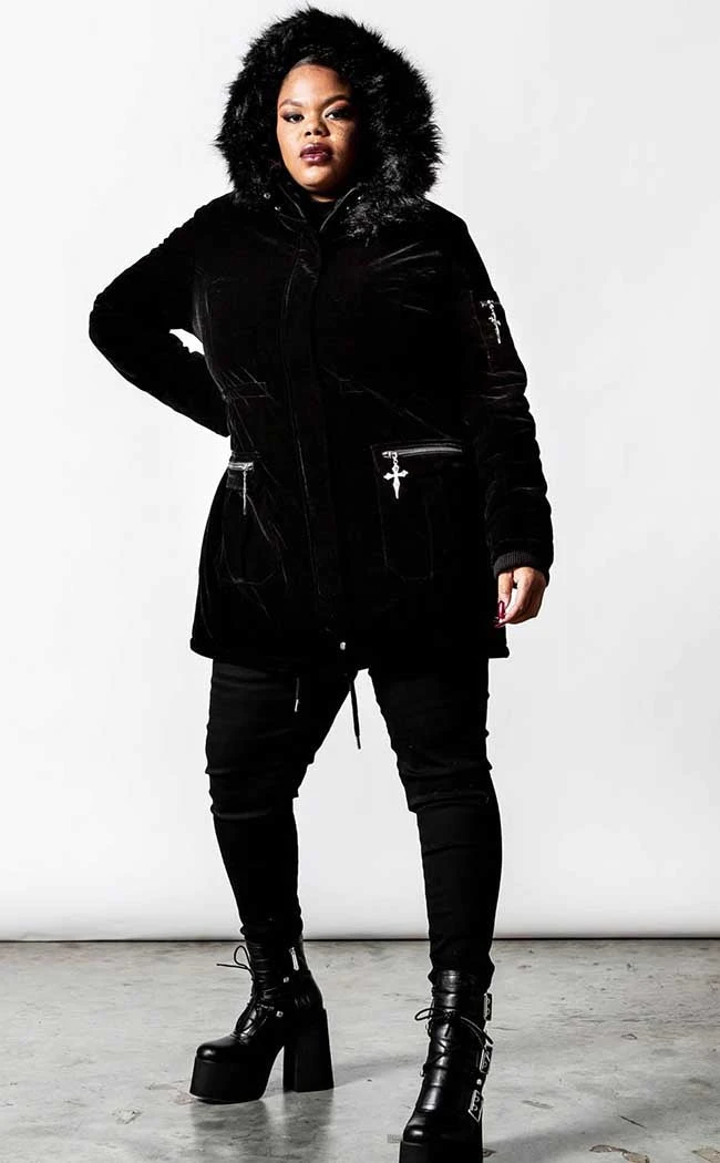 Battle even the iciest winds in the Stormy Daze Parka Jacket! Soft-touch velvet keeps you looking chic on the outer while the lining keeps you extra toasty. The faux fur hood and cross zip charms add a touch of glam to this practical yet chic jacket.