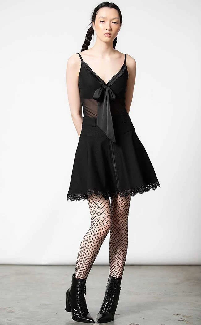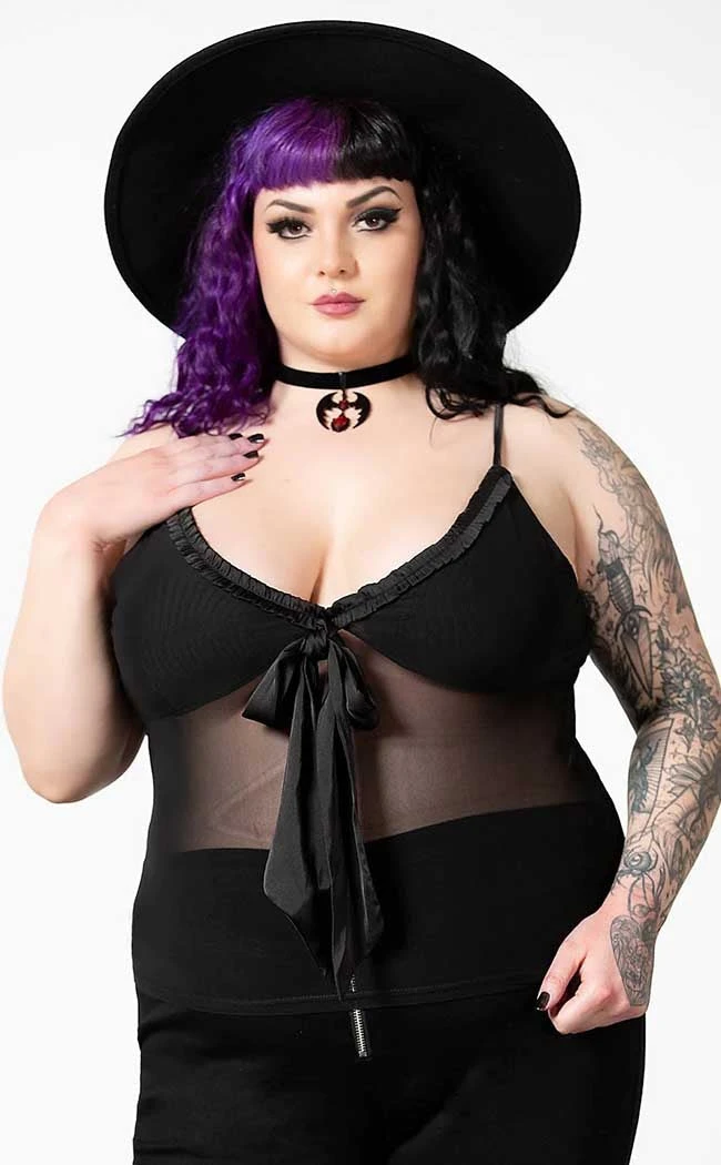 The Yuna Ribbon Mesh Top will have you lookin’ cute in a snap! This soft mesh tank features thin, adjustable straps, frill trims and a large, statement chiffon tie. The chest comes with non-padded opaque cups so you can wear this piece alone or with boleros and fishnets.