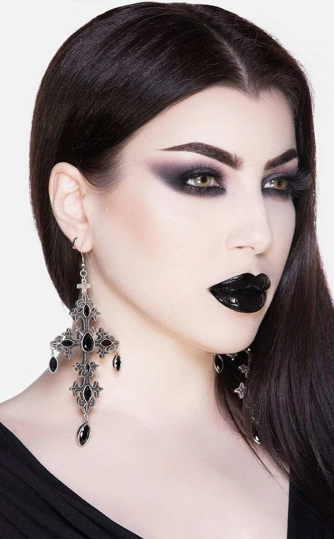 Make evil yer best accessory with the Crossed Desire Earrings! These elegant crucifixes feature elaborate detailing and are embedded with pitch-black gems as well as matching charms that hang from the points.