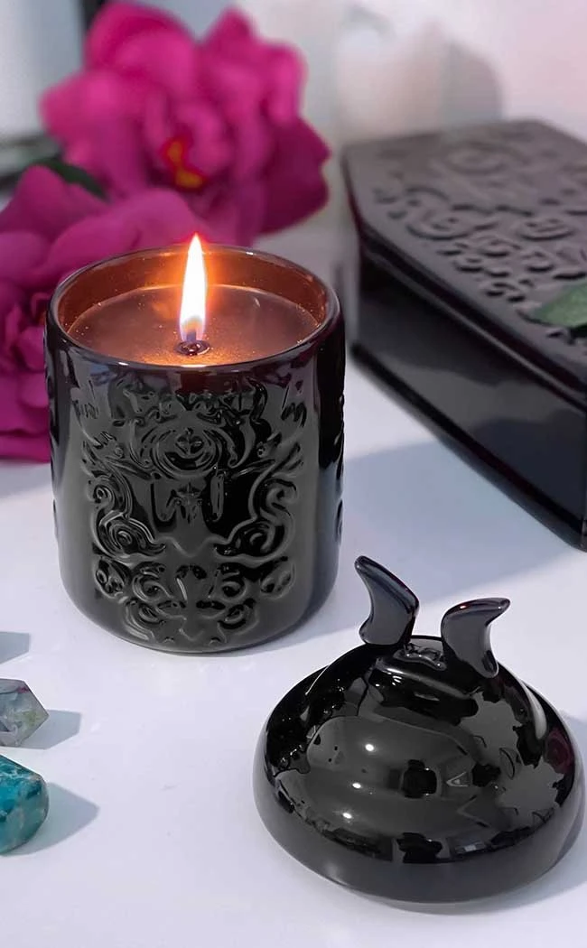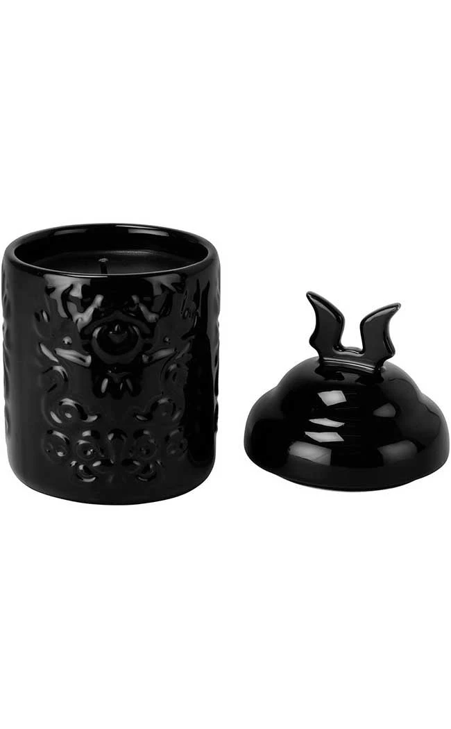 Gift yer BFF an unforgettable Xxxmas or treat your boudoir to a brand new aromatic atmosphere with the Daemon Ceramic Candle! Pitch black soy wax scented with coconut fills a sleek ceramic jar, coming with a batwing lid and embossed filigree details.
