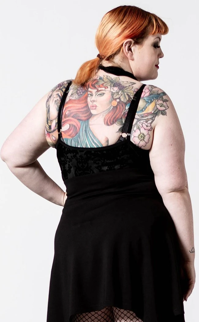 Get summergoth ready and drop their jaws with the Daemonic Forces Bodysuit! Super stretch velvet hugs yer bod with a statement filigree pattern that’s just screaming to be paired with the rest of yer wardrobe. Thin shoulder straps make this piece perfect for pairing with fishnets and statement necklaces.