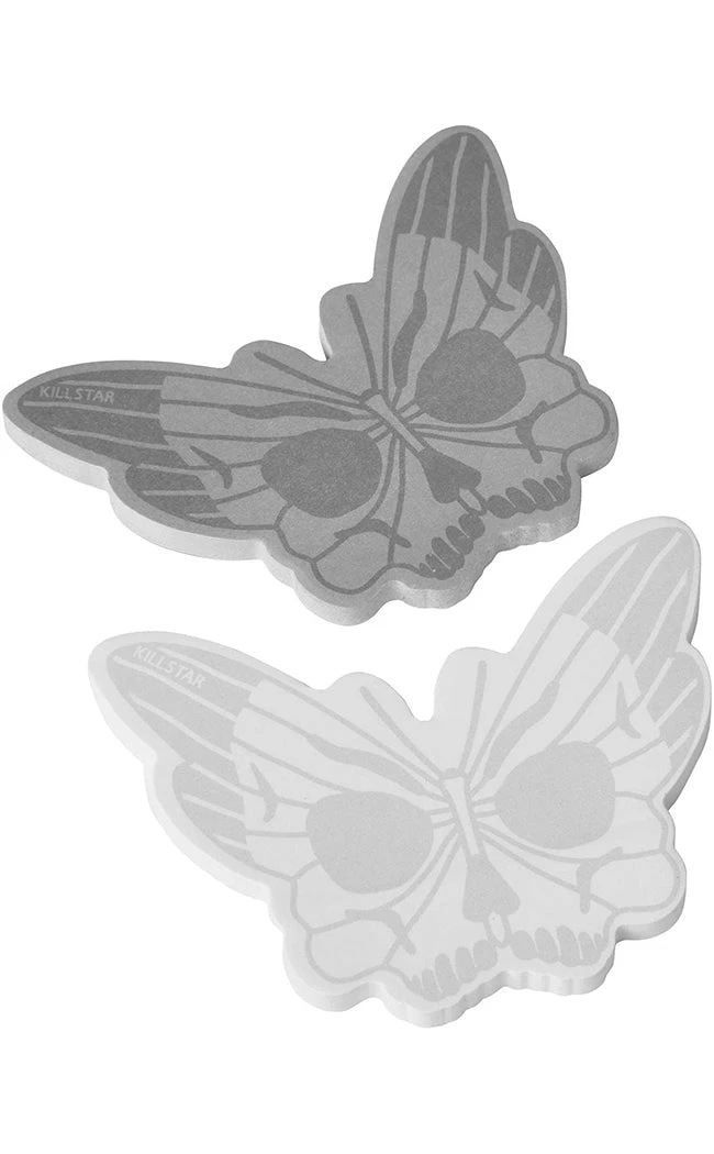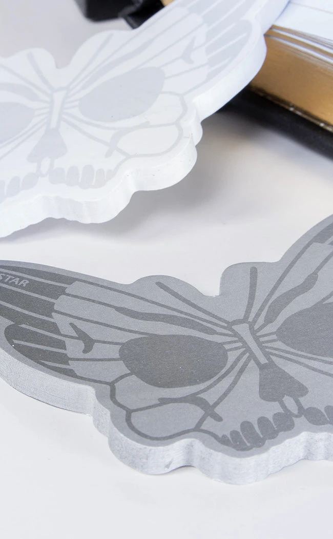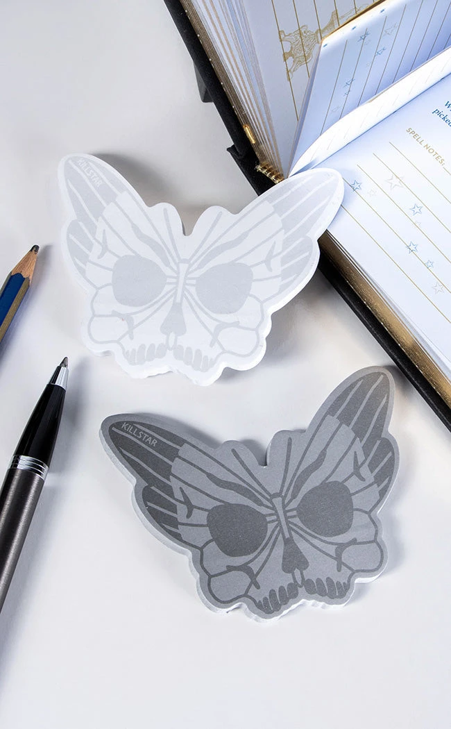 Jot down yer ideas on the wings of a butterfly! The Darkspell Sticky Notes are shaped like butterflies and feature a spooky skull print. Each pack comes with two reams of notes: one white and one grey.