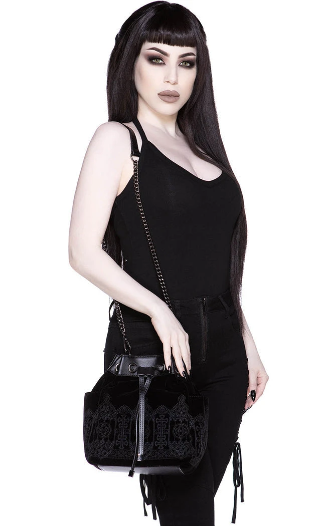 Look every bit the Satanic temptress with the Devil’s Mistress Handbag! This cute bucket bag is trimmed with faux leather, featuring a drawstring pull, contrasting lining and a statement cathedral-like print on the outside. Choose between a long chain shoulder strap and a short, faux leather handle, both detachable!