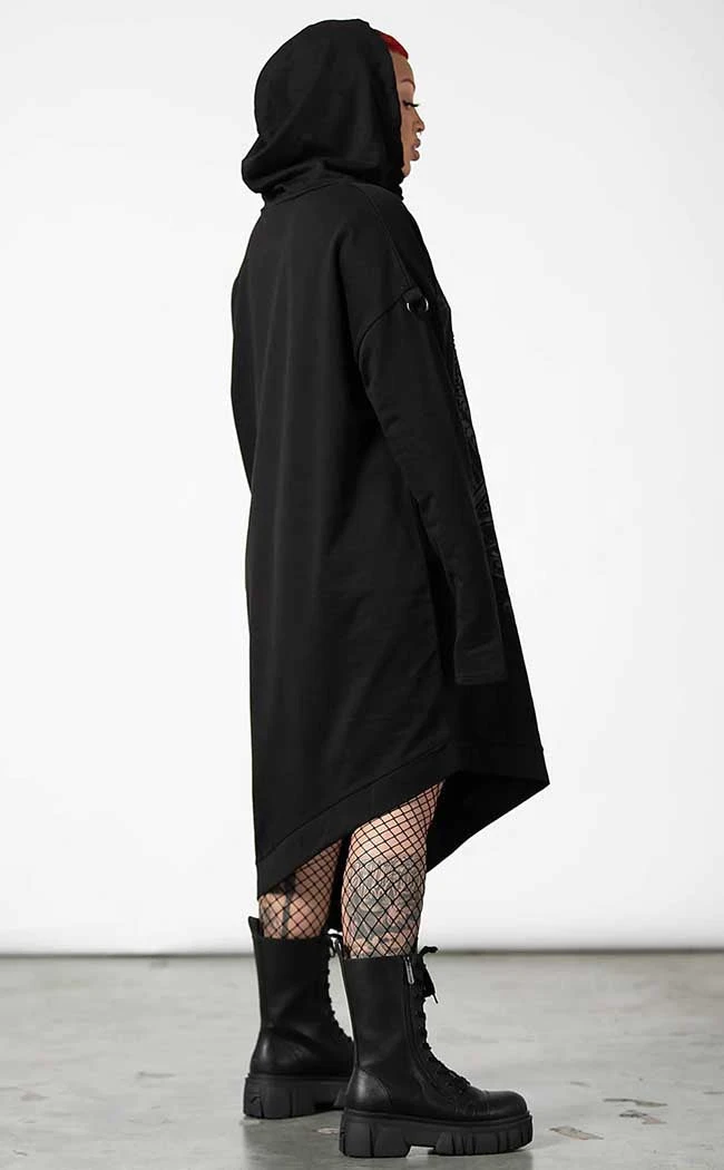 Get the absolute in IDGAF winter fashion with the Dispare Asymmetrical Hoodie! This oversized winter warmer features a statement black-on-black print, an oversized hood, mesh insets and chain details. Pair with shredded jeans and yer fave combat boots!