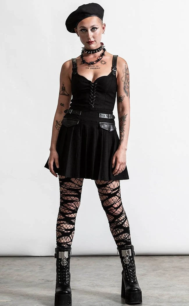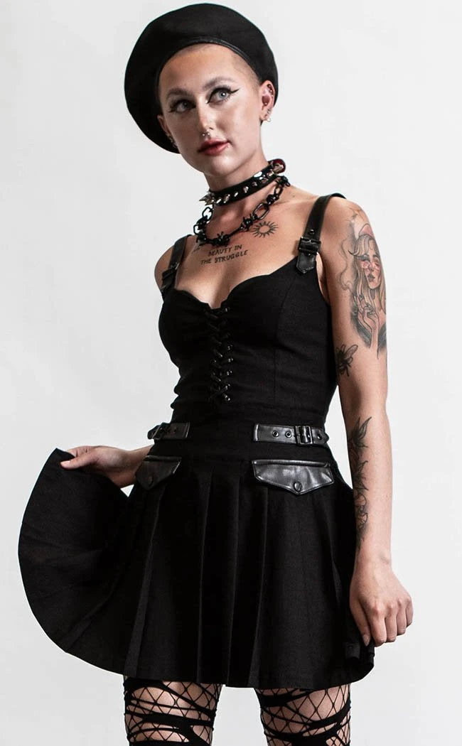 The Distortion dress has a sultry low neckline with a lace-up decal down the middle. Faux leather details like the statement shoulder straps, buckles, and pocket flaps will make you look at home in any rebel army.