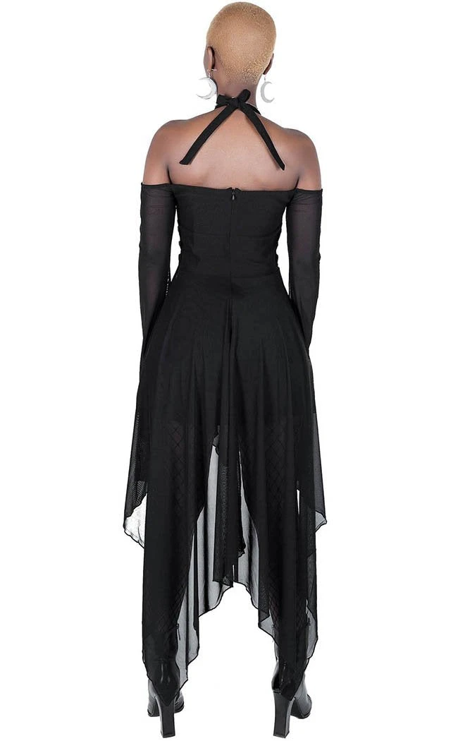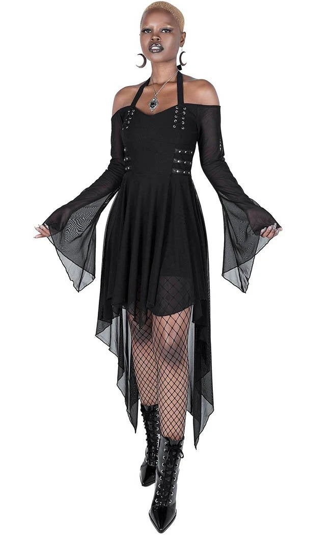 Float across the floor in this flowing figure of beauty! The sexy halter neck and cold shoulders show plenty of skin and leave plenty of room to show off yer fave pendants. The waist is fitted and flows down to an asymmetrical hanky hem which matches with the dramatic bell sleeves. With extra touches like lace-up and studded panels, you’ll be feeling beautiful and badass.