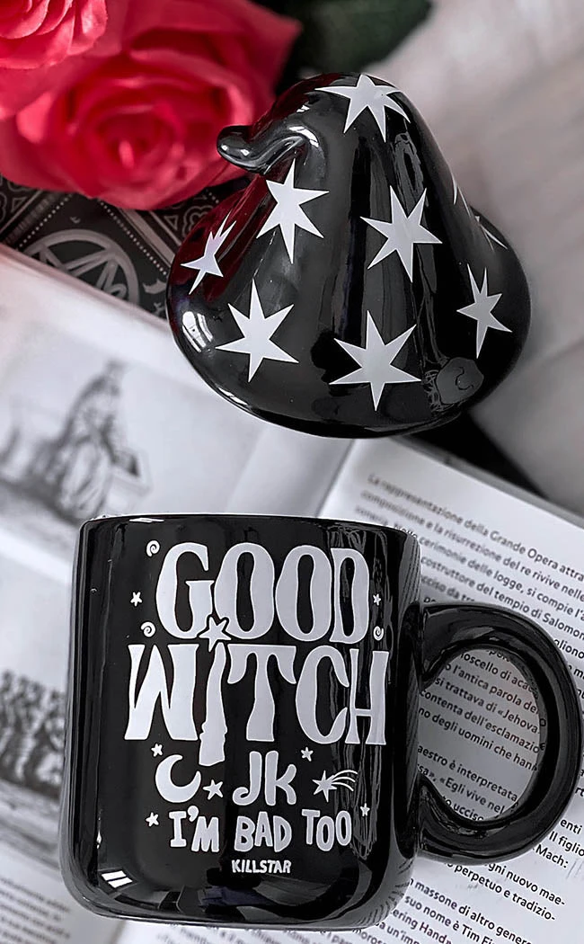 Sip on your favourite brews with the Good Witch Mug! This adorable mug comes with a witchy hat covered in stars that helps keep your brew warmer for longer. The mug is printed with a cute, witchy font that says “Good Witch, jk, I’m bad too” and finished with a sleeky, shiny gloss.
