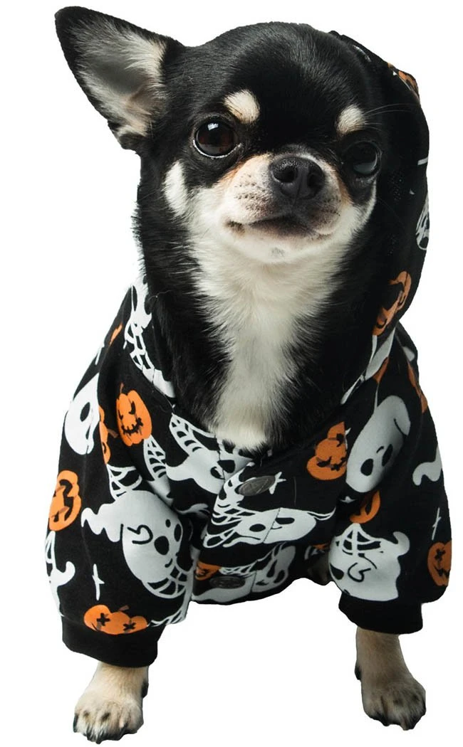 Keep your furbaby warm and Halloween ready with the Haunted Pumpkin Pet Hoodie. Made of super-soft jersey, this little outfit features a large hood, a vibrant spooky print and sleeves for the front legs. The hoodie secures with press studs for no stress on/off.