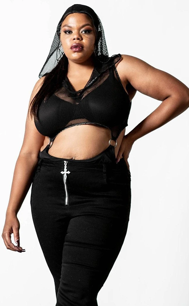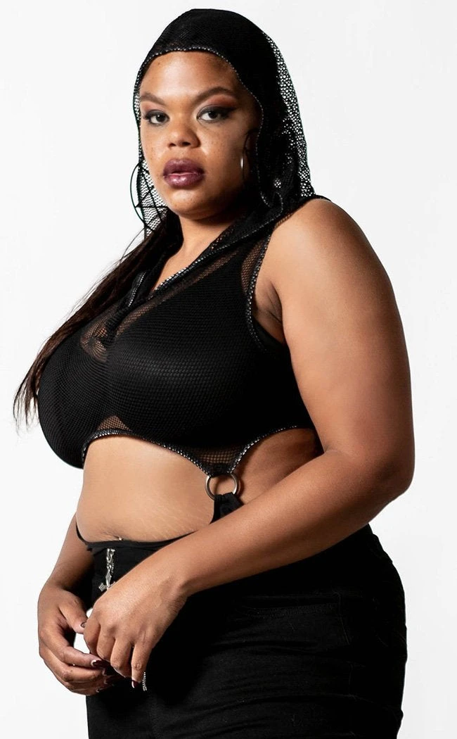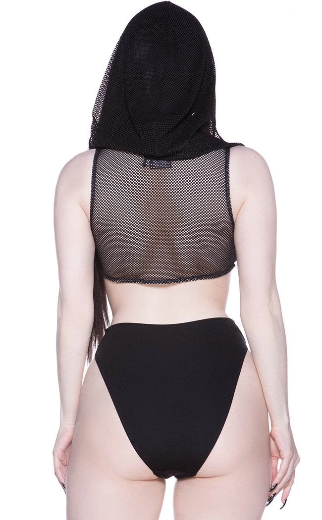 Be your fiercest self in the Hellen bodysuit!  The body-hugging fit splits between a hooded fishnet upper with a plunging neckline and an opaque bottom. The two sections connect with straps and D rings, leaving a sexy cutout at the waist.