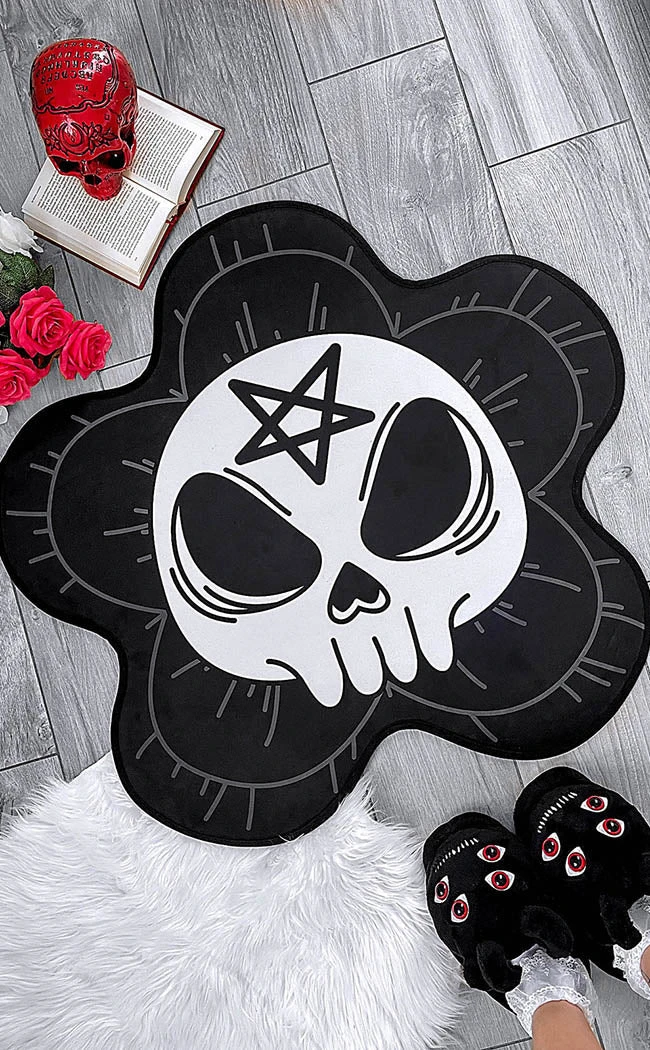 Turn your crypt into a garden of horrors with the Hemlock Rug! This unique rug is shaped like a flower, featuring a contrasting skull at the centre. The short pile fabric is soft on yer feet and comes with an anti-slip backing that lets you place it on all kinds of flooring.