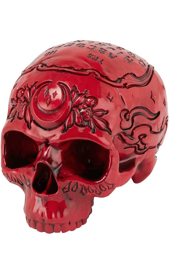 Add a spooky spirit to yer crypt with the Spirit Board Resin Skull! This blood-red skull is xxxtra large yet lightweight, so it can take centre stage on shelves, tables or even your altar. The surface is embossed with gorgeous spirit board lettering, florals and other mystical details.