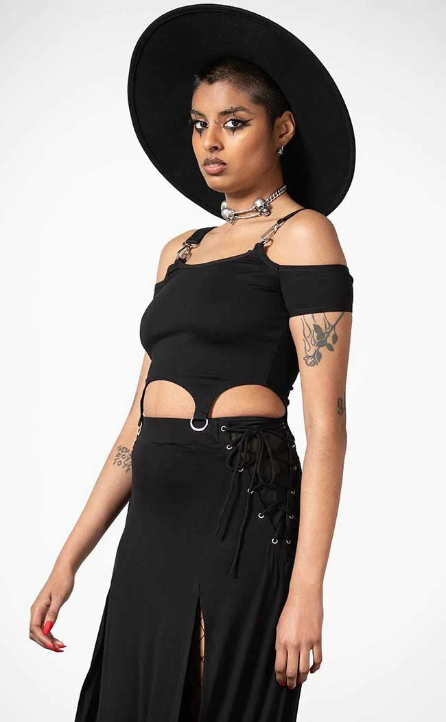 Meet yer new face not-so-basic! The Hurricane Crop Top features soft, slightly stretchy fabric that forms a bardot neckline with buckled, faux suede shoulder straps. The hem features statement D rings for a touch of heavy metal and decking out with chains, charms or whatever you please.