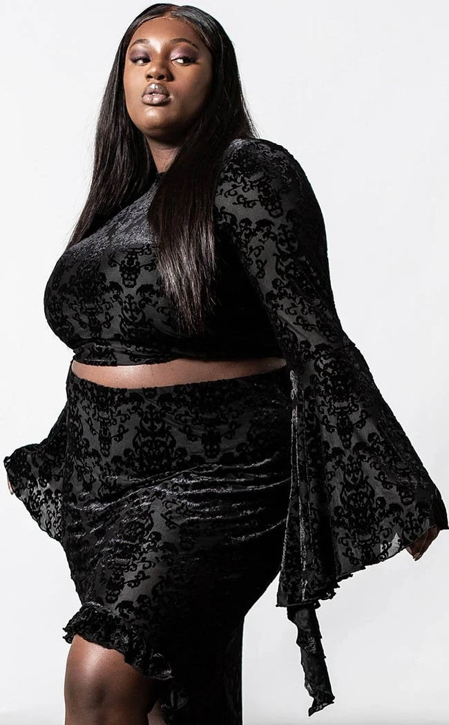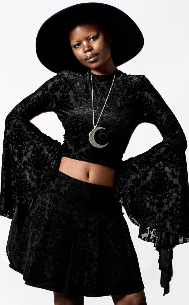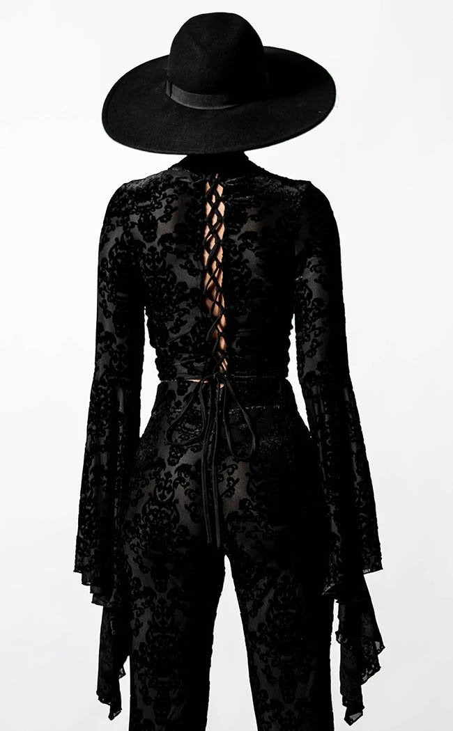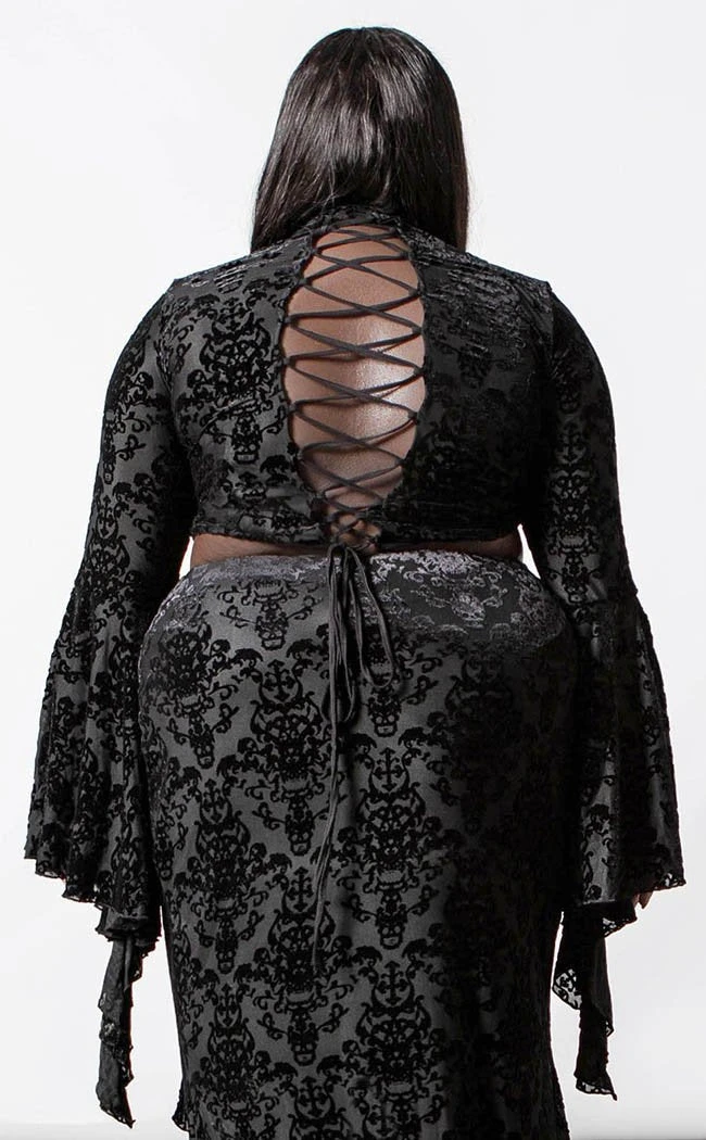 Watch a glorious rebirth in burnout velvet and drama! The Incarnate Lace Up top is a high neck crop that’s fitted to your gorgeous bod. The long sleeves flare into a dramatic waterfall so you can look extra magical when casting yer hexes. The rear features a lace-up detail for extra retro sexiness.