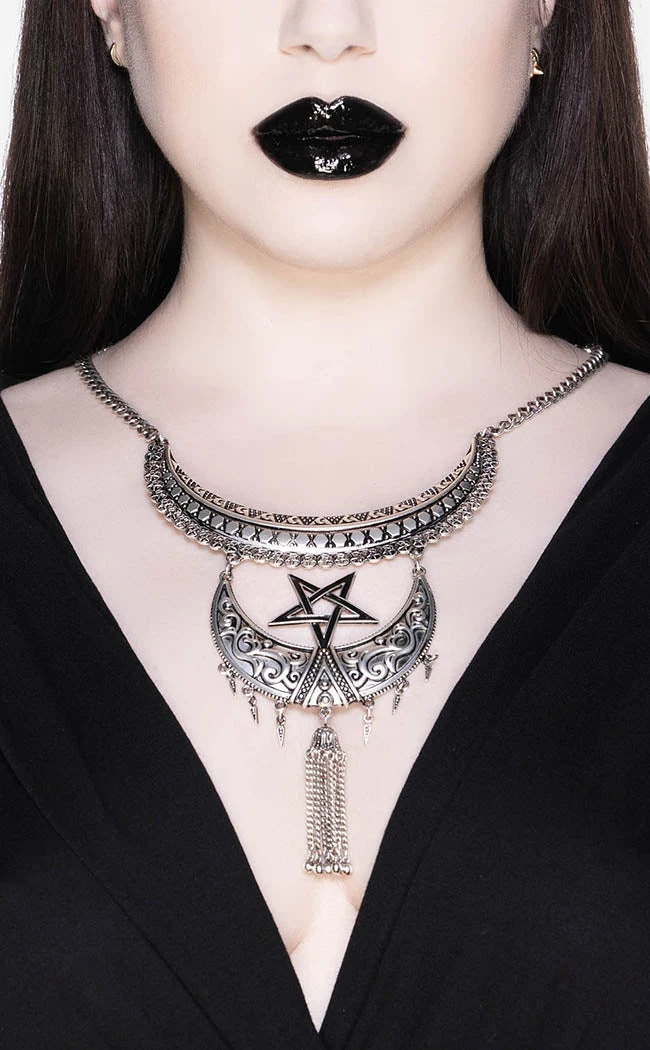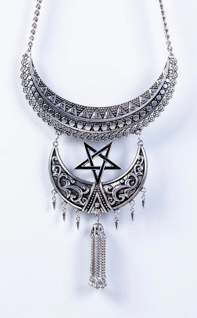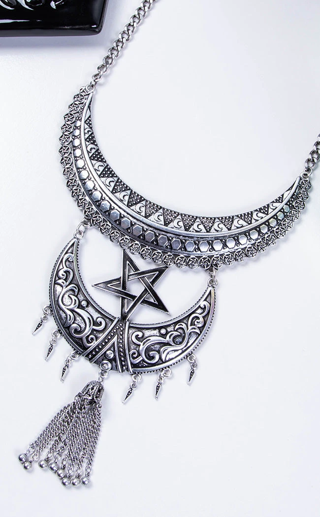 Complete any dramatic entrance with the Ancestral Night Necklace! Two layered crescent pendants feature exquisite details like filigree patterns and embossed witchy symbols. The smaller crescent showcases a pentagram, small hanging charms and a fringe pendant.