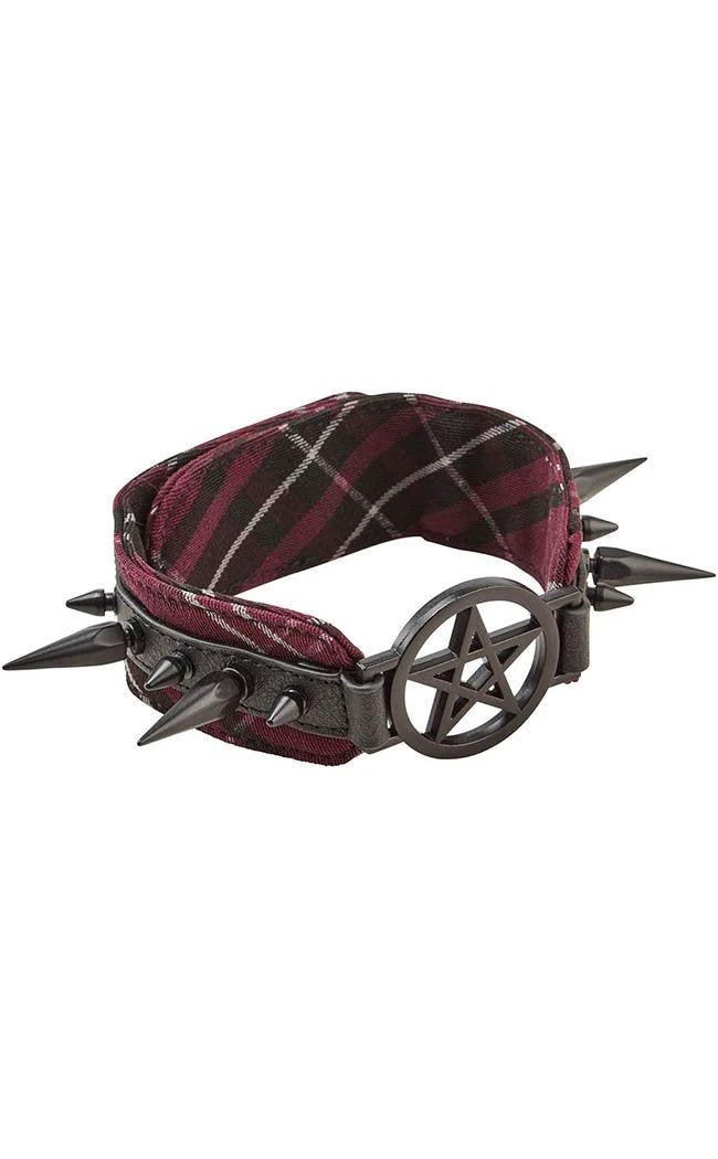 The chunk band is kit out in dangerous lookin’ spikes, cut into by a chunky pentagram at the centre. The band secures at the back with a button closure.