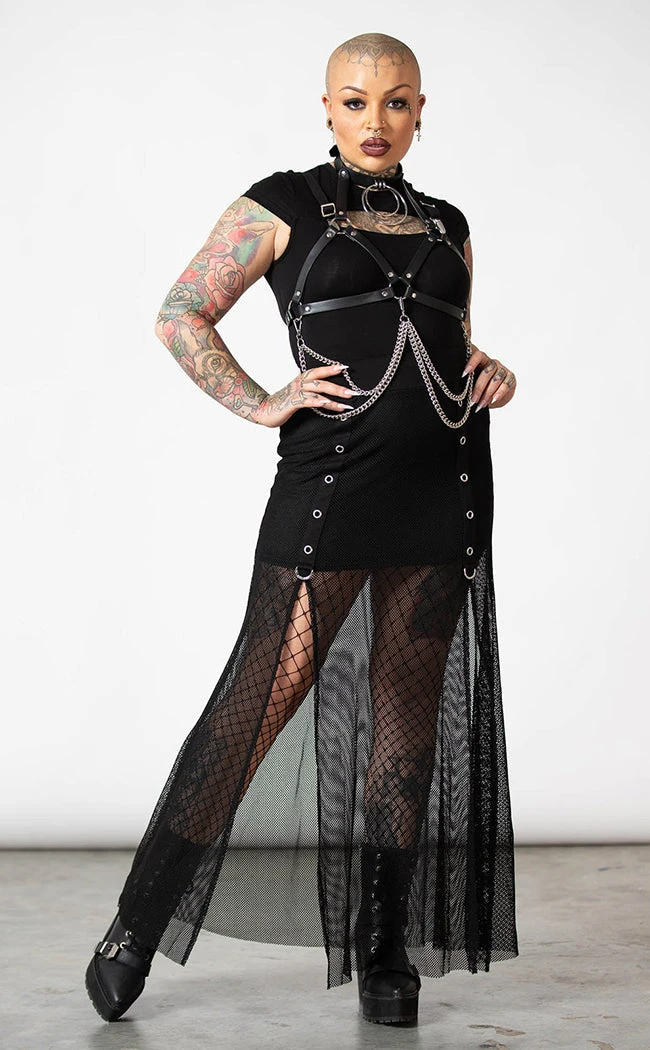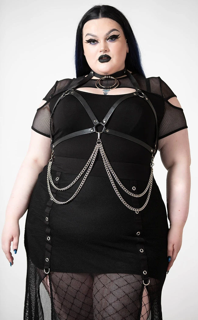 Resurrect yer wardrobe with the Lethal Circle Harness! This statement chest harness was conjured from luxe faux leather, featuring adjustable straps, a double O ring choker, an adjustable buckle choker and a detachable chain that hangs around the waist.