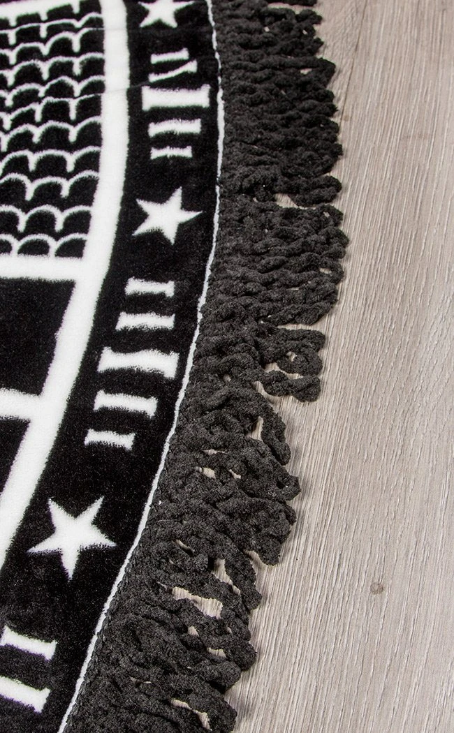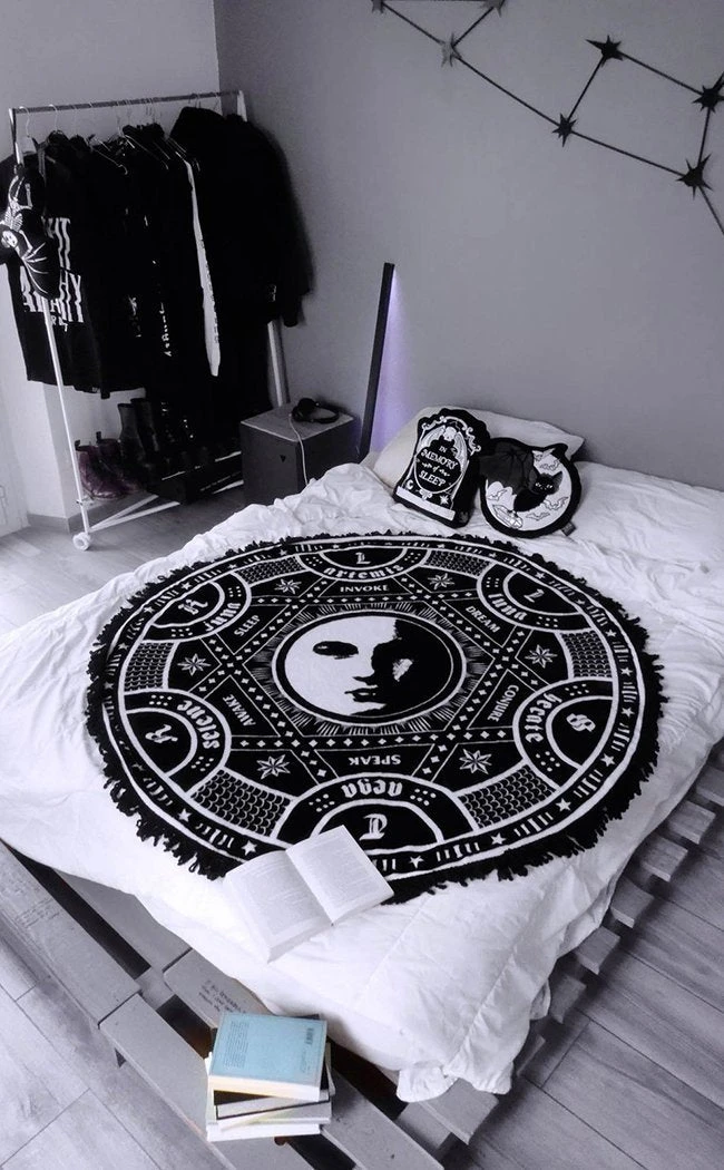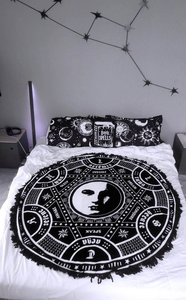 All things become clear in the light of the moon. A shadowed lunar face sits at the centre of a 6 pointed star, surrounded by elaborate text and serpent scale patterns. Lay over your doona or curl up on the couch with lunar magick.