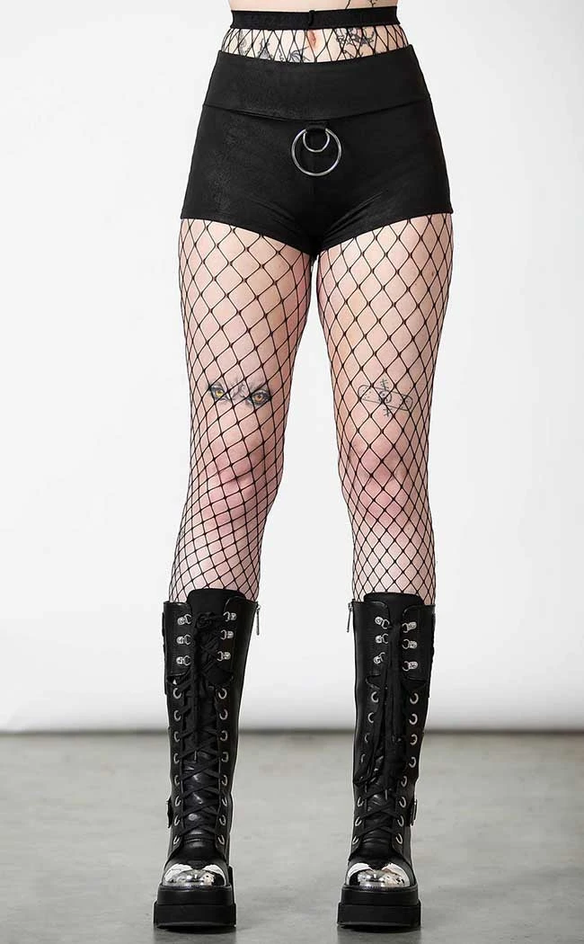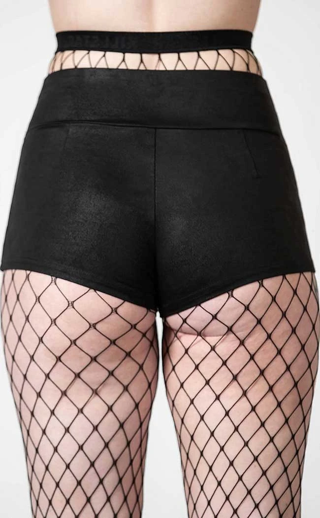 Show off that spooky booty in the Melvina Hotpants! These stretchy shorts are made with a suede look fabric for a luxurious texture and feature a wide elastic waistband for the perfect comfort fit. The front features two O ring charms to add an extra pop of metal.
