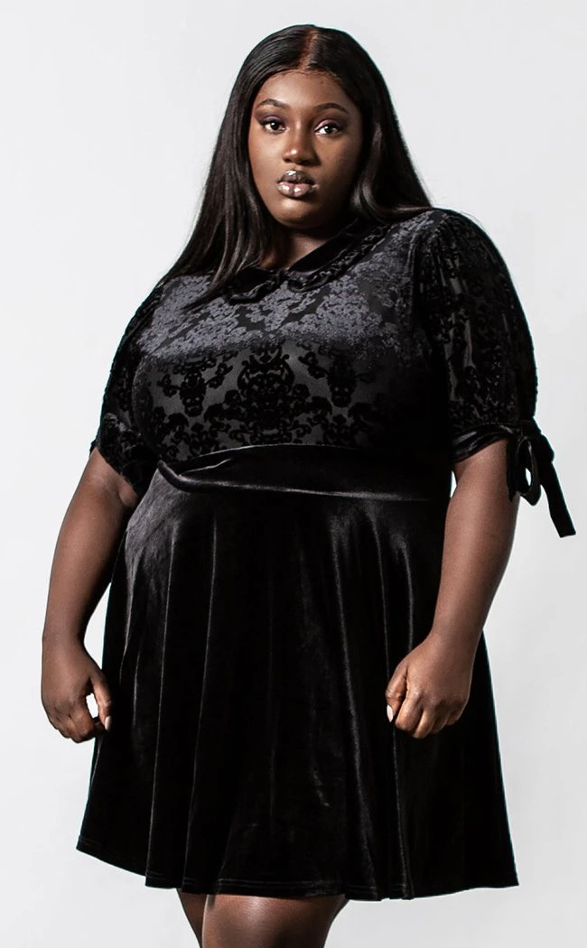 We love ourselves some texture contrast! The delightful Miss Furfur dress is a dream to style, featuring a burnout patterned upper with a frilly collar, elbow-length tie sleeves and an open back. The contrasting skirt is a flowing black block of velvet cut to a skater length.