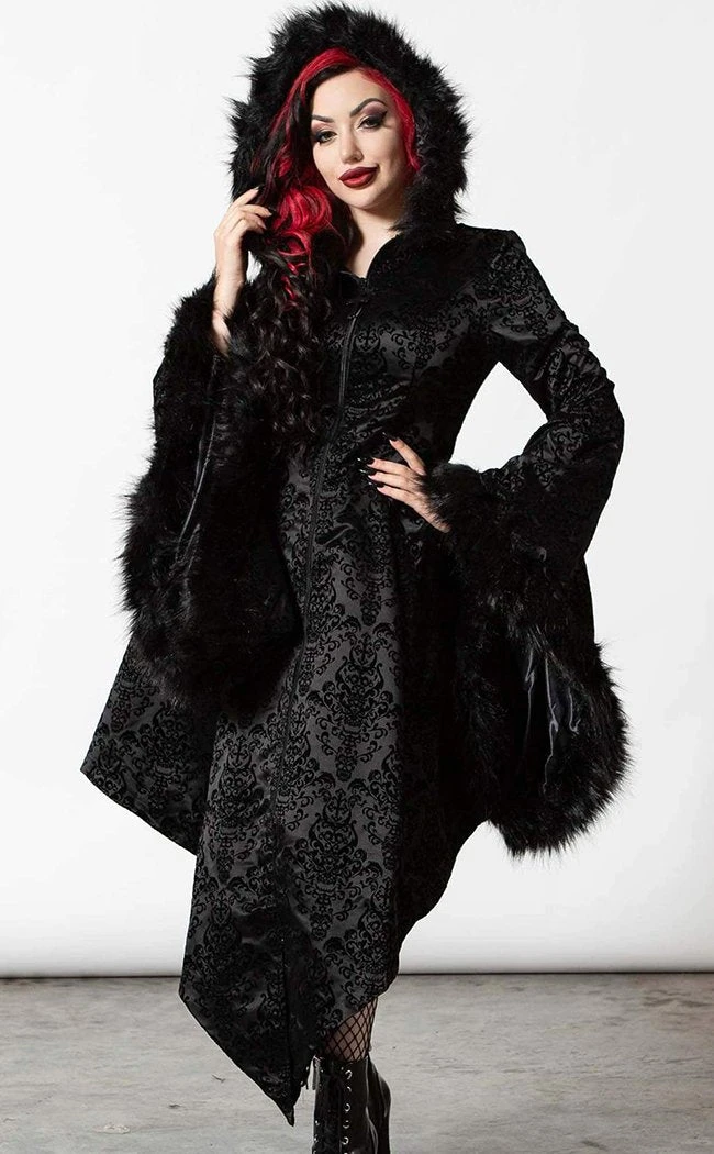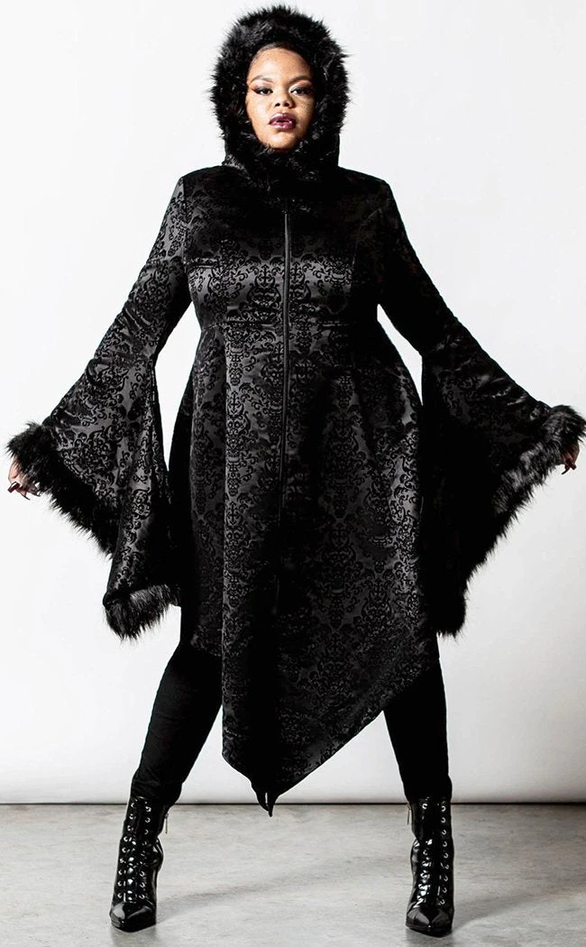 The Moonspell Hooded Coat is an extravagant affair, its long waterfall sleeves and dark, mysterious hood trimmed in luxe faux fur. The embossed velvet fabric breathes morbid Victorian vibes into the air, fitted at the waist and hugging your curves as it falls into a witchy asymmetrical hem.