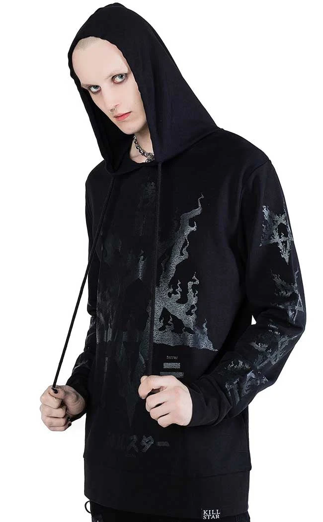 Keep it dark n’ spooky in the Night Terror Oversized Hoodie! Made with super soft jersey, this hoodie features a large hood, a black-on-black print and a relaxed fit for maximum cosiness.