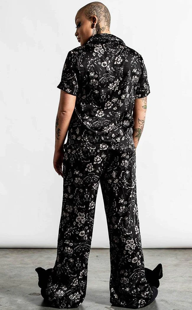 Stay up past the witching hour in the No Rest for the Wicked PJ set! Featuring a short-sleeve shirt and long pants, both pieces are made with super soft satin in a relaxed fit that will have you screaming for joy. The beautiful print of moths and flowers will have you laying in a garden of dark desires, the best bed for sultry dreams and back support.