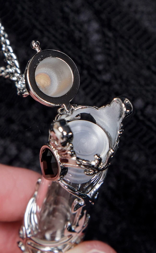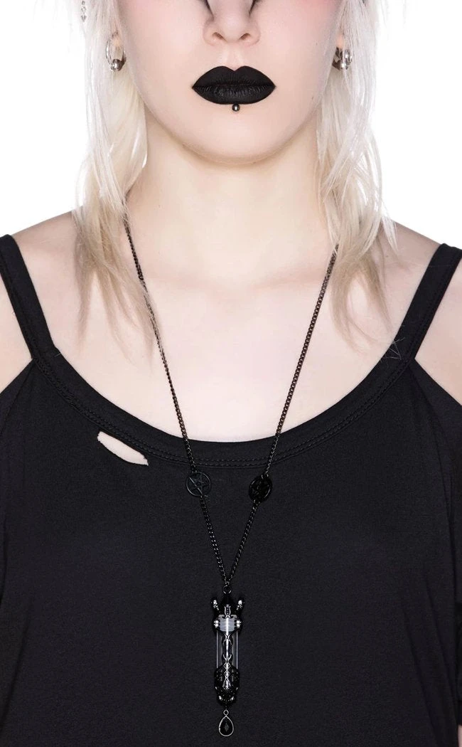 The ‘Ophelia’ vial necklace is the ideal accessory for any magical girl or guy. The necklace comes with a long black chain, glass vial and black touches and pentagram details.